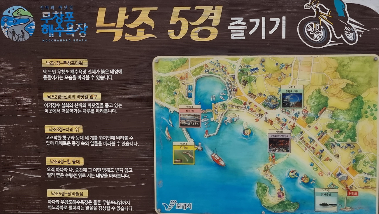 무창포해수욕장에서 낙조 5경 포인트도 있는데 낙조1경은 무창포타워, 낙조2경은 신비의 바닷길 입구, 3경 다리위, 4경은 흰등대, 5경이 이곳 닭벼슬 섬이다,