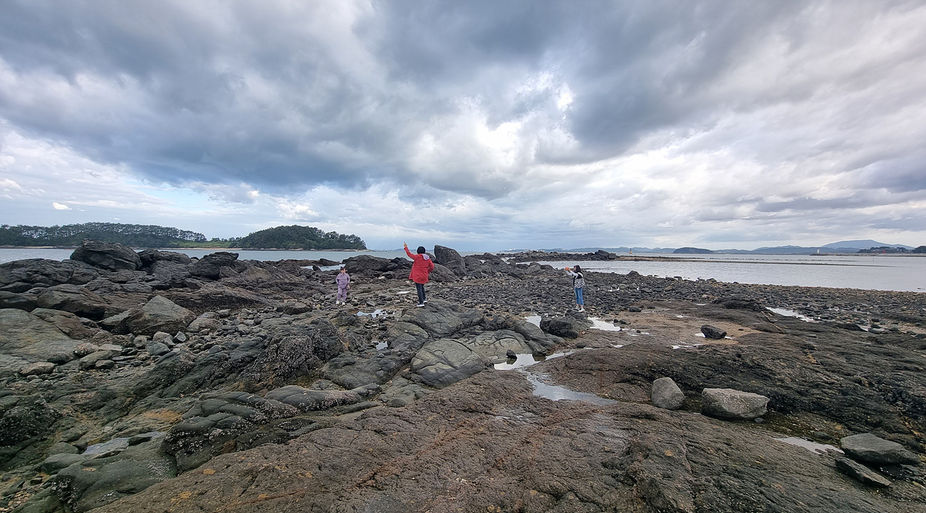 달벼슬 섬이세 이어지는 갯벌은 갯벌이 아니라 섬에서 뻗어내린 돌 밭이다,