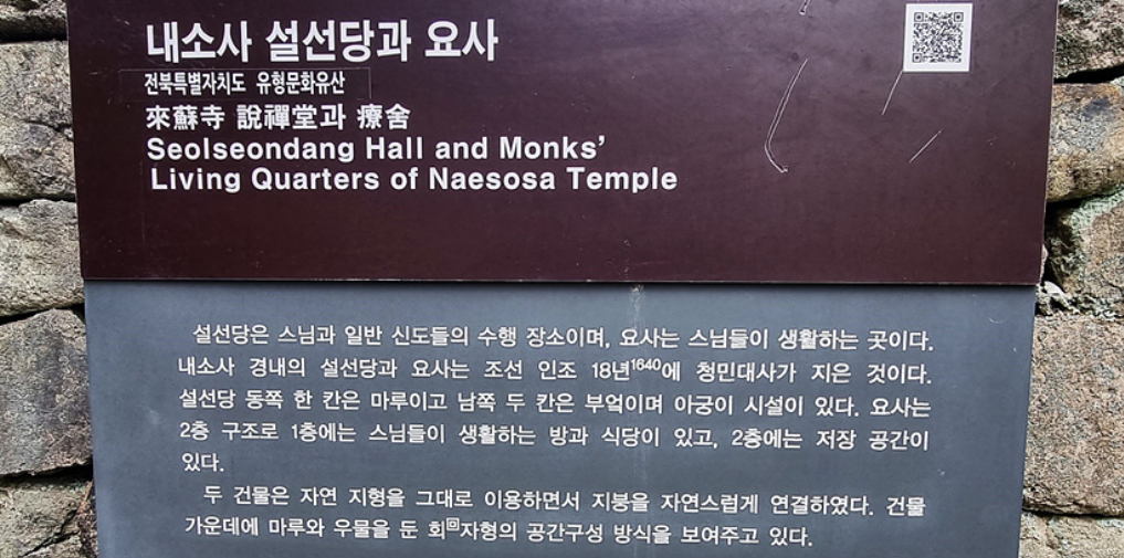 내소사 설선당(來蘇寺 設禪堂)과 요사 (寮舍)다, 설선당은 인조 18년(1640)에 청영대사가 지은 것으로 앞면 6칸, 옆면 3칸의 지붕 옆면이 사람 인(人)자 모양인 맞배지붕집이다.