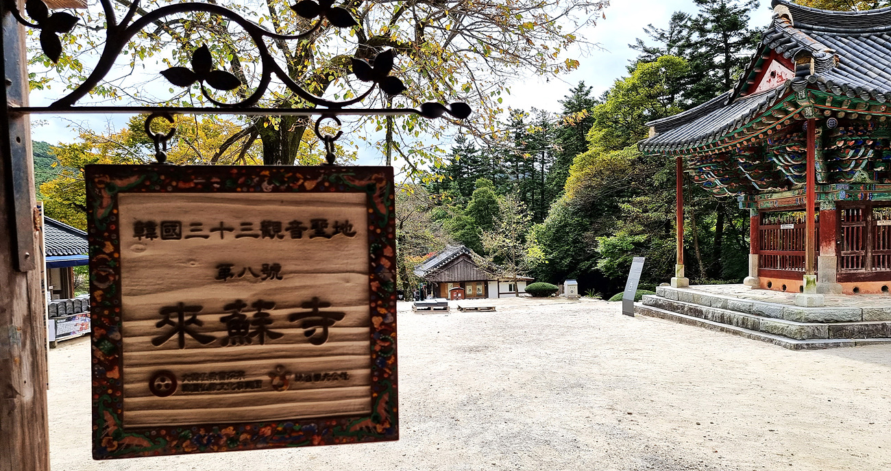 봉래루 아래로 나가는길 봉래루 누각 기둥에 한국33 관음성지 제8호 내소사라는 현판도 보인다,