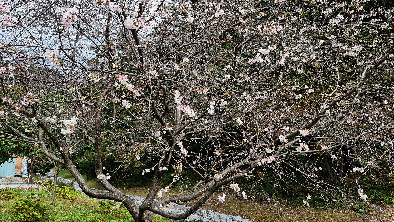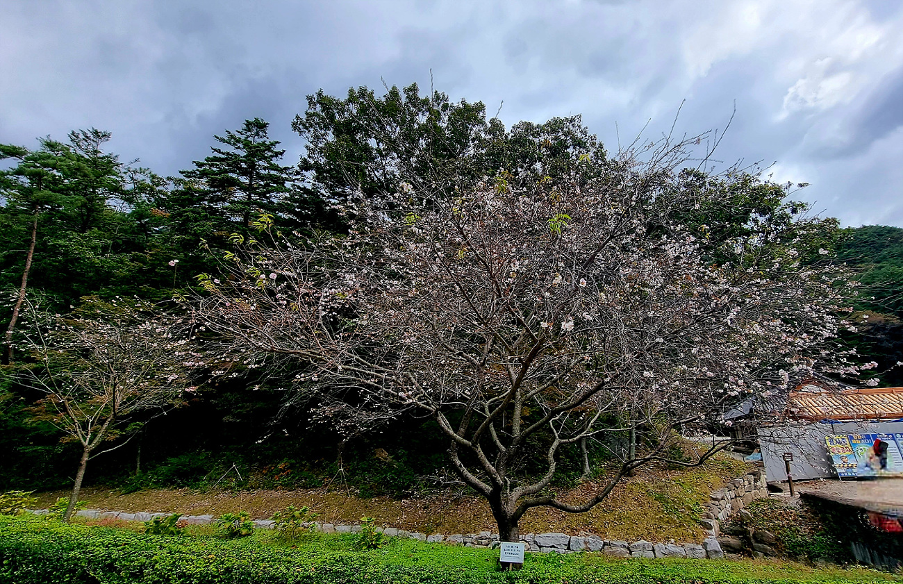 그러나 이 벚꽃은 봄, 가을, 일년에 두번 피는 춘추벚꽃 이라는 안내가 있다,