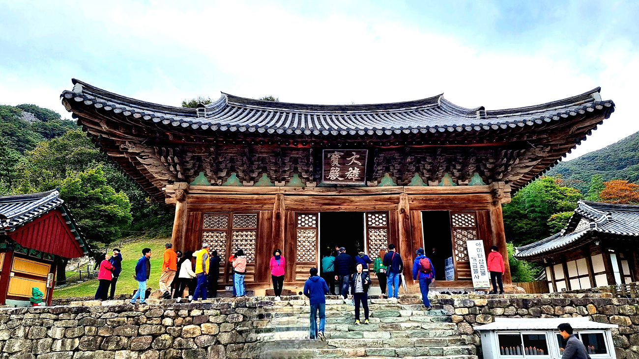 대웅전 지붕은 처마를 받치기 위해 기둥 위 부분에 장식구조가 기둥 위 뿐만 아니라 기둥 사이에도 있는 다포 양식인데, 밖으로 뻗쳐 나 온 부재들의 포개진 모습은 우리 옛 건축의 특징을 잘 보여주고 있다. 대웅보전 한옥 구조는 기단에서 부터 용마루까지 생각보다 복잡하기만 하다,