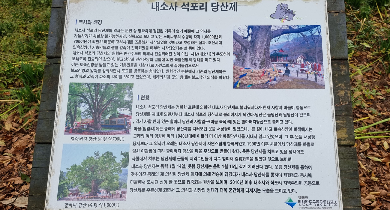 내소사 석포리 당산제 역사와 배경에 대한 안내도 있는데 내용을 요약하면 석포리 당산제의 역사는 문헌상 기록이 없기 때문에 그 역사를 가늠하기가 불가능 하지만 신목으로 모시는 느티나무의 수령이 1,000년과 700여년이 되기 때문에 고려시대나 조선시대 민속신앙이 기층민들의 생활 깊숙히 전파되였을 때 부터 시작되였다는 설이 있다,