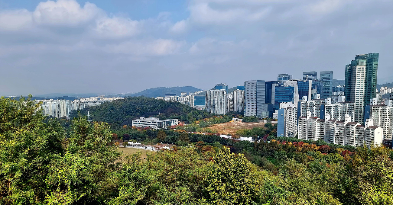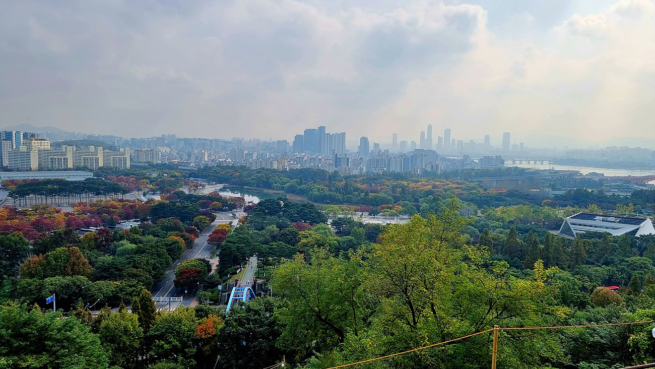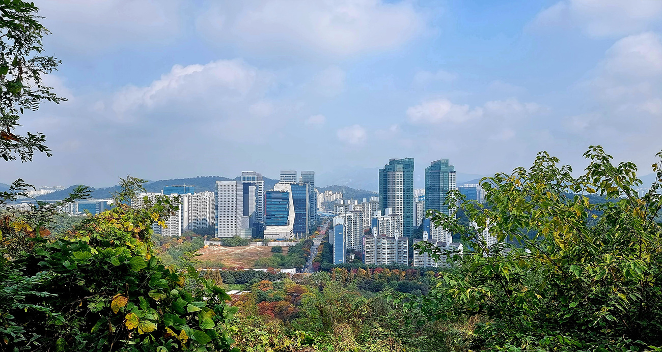 해맞이 명소 전망대에서 보이는 사진 중앙 상암근린공원 산 자락에 박정희대통령기념도서관이 있다,