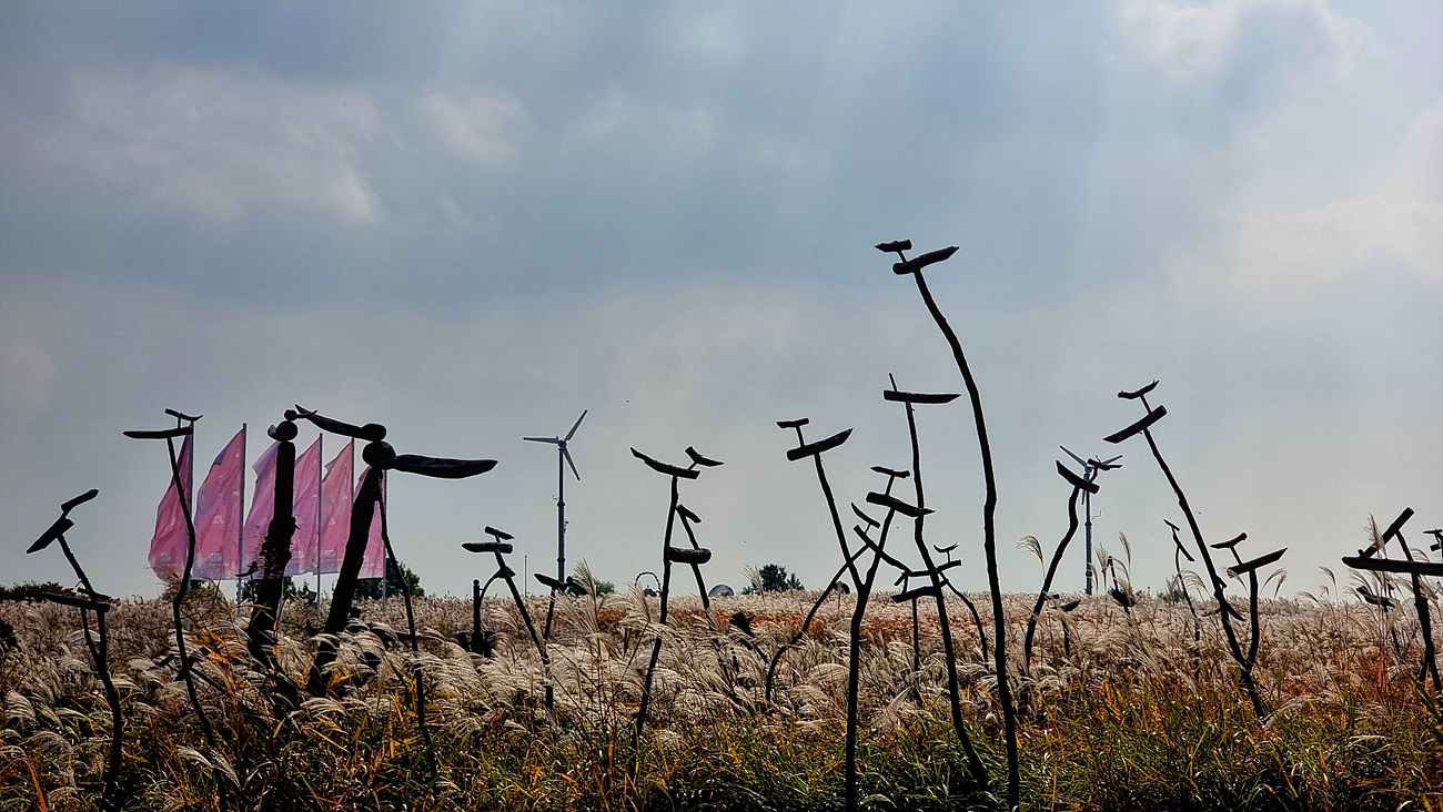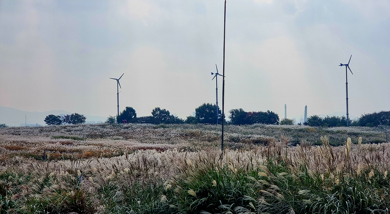 하늘공원에 억새축제가 열리는 시기는 10월말이다. 가을 억새가 천국을 이루고 있는 이곳은 풍력발전기 다섯 대가 바람을 품고 노을을 품는다.