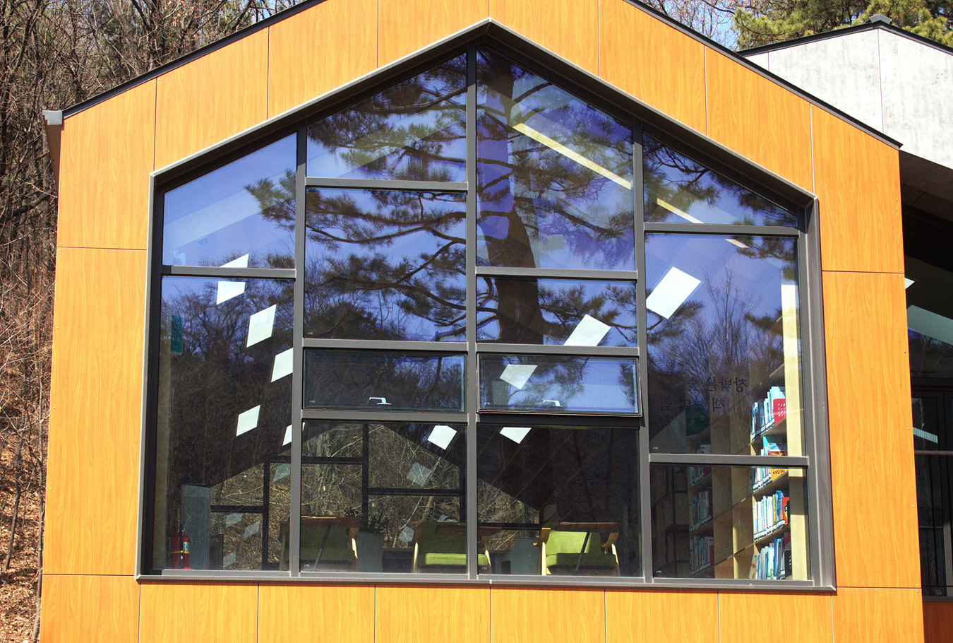 자연체험학습원 중앙에 자리한 책 쉼터는 새 집을 형상화 해서 만든 건물로 최근에 새로 신축했다,