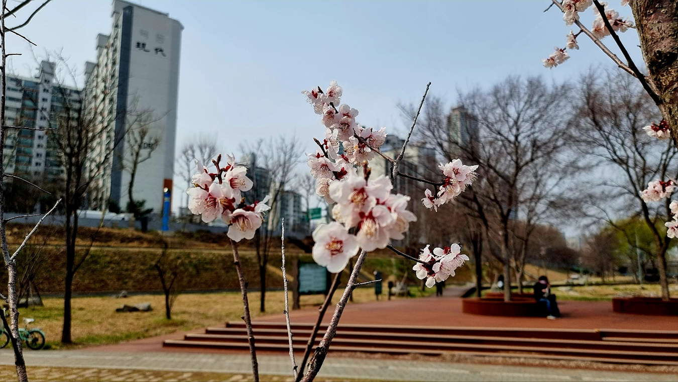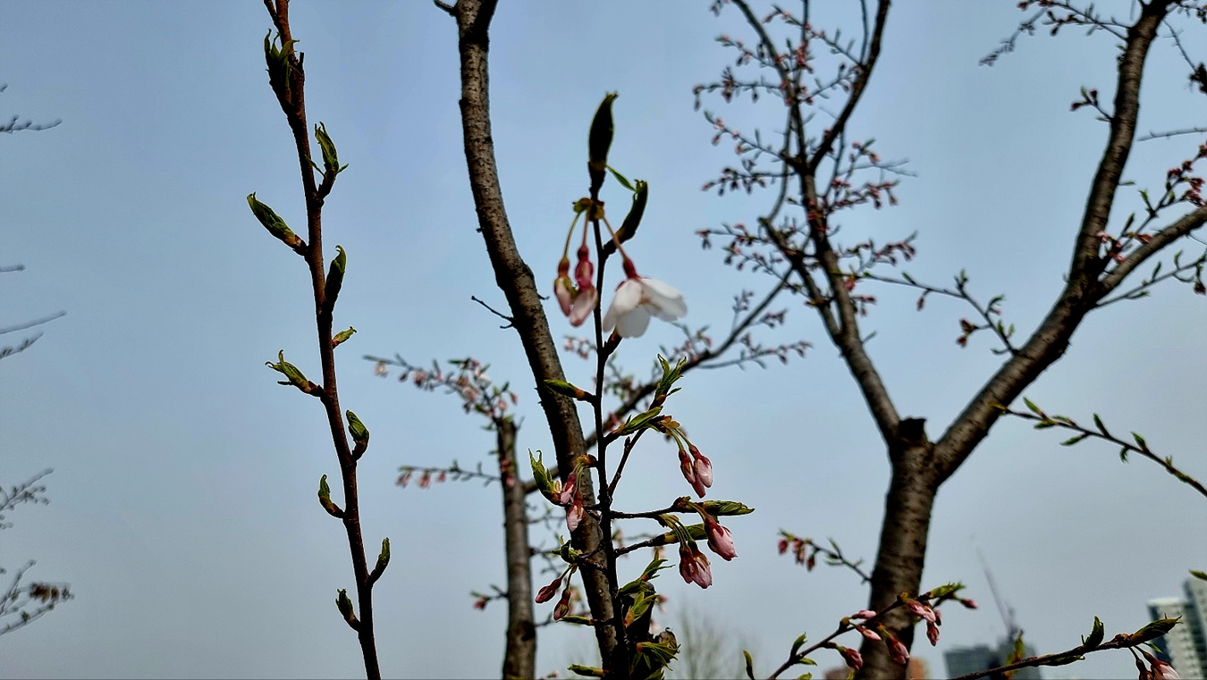 이곳에는 벚꽃이 몽우리를 티우기 시작했다,
