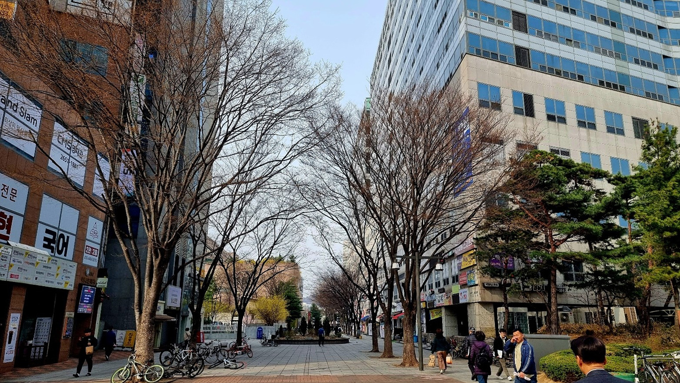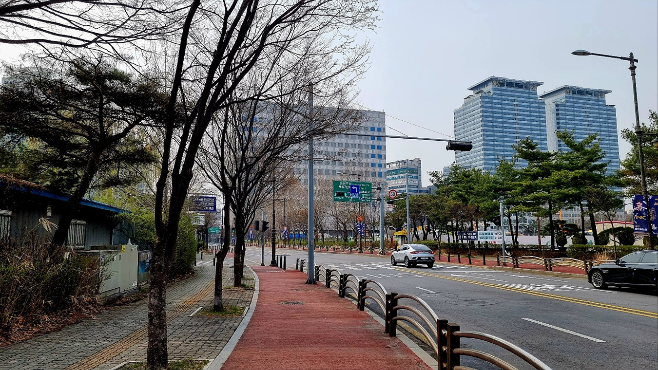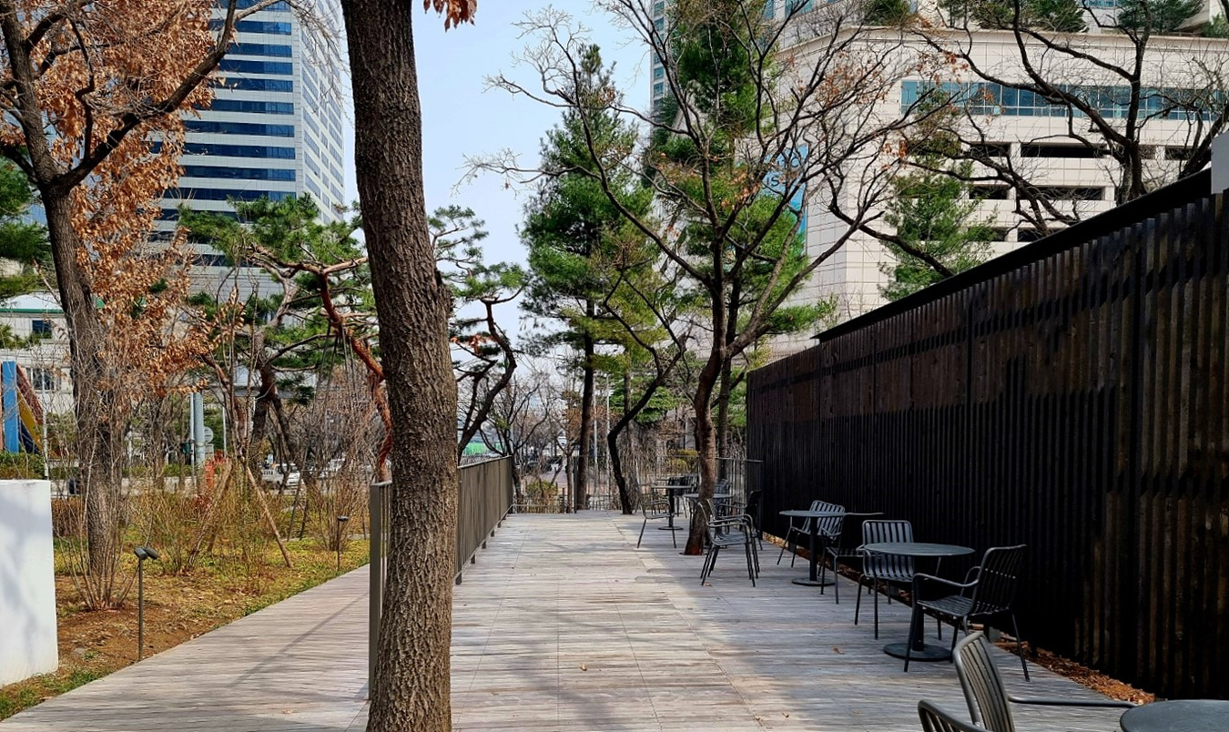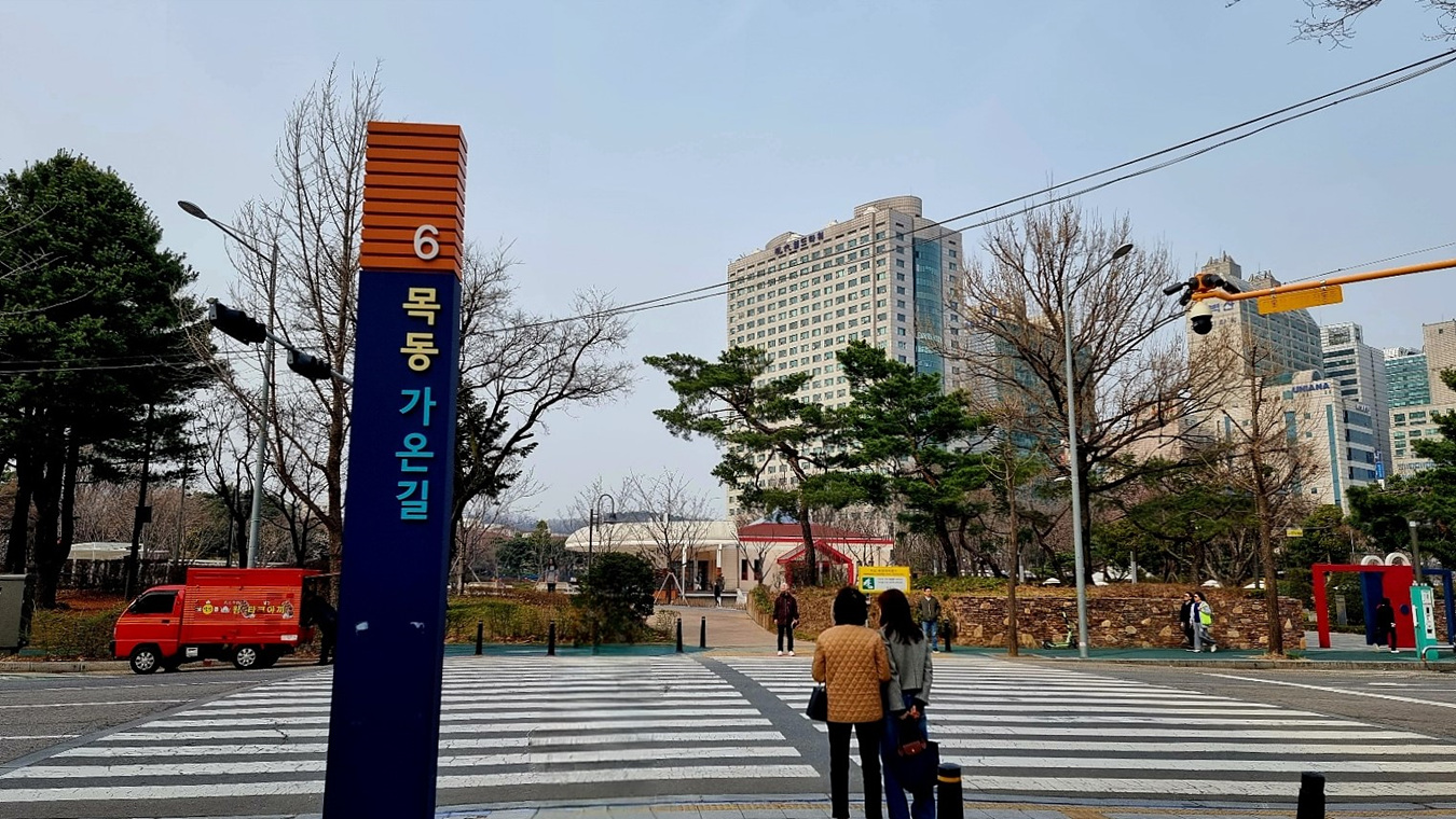 목동파리공원로 건너가는길, 이 길의 이름은 "목동가온길"이다, 가온길은 하이페리온 빌딩 현대백화점에서 파리공원까지의 빌딩숲 샛길이다,