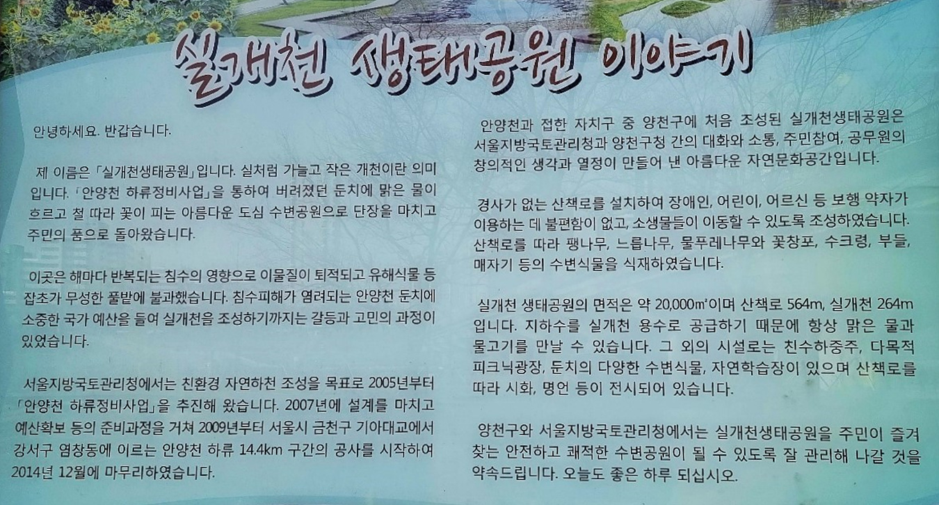 실개천생태공원은 실처름 가늘고 작은 개천이라는 의미라고 했어며 안양천 하류정비사업을 통해 버려졋던 둔치에 맑은 물이 흐르고 철따라 꽃이 피는 도심 수변공원으로 꾸몄다는 생태공원 조성 안내도 해 놓았다,