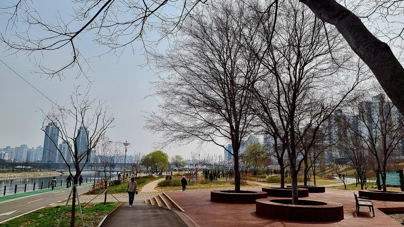 안양천변 양천구간은 잘 꾸며진 둔치공원으로 관리 직원들이 분주하게 봄 맞을 준비를 하고 있다,