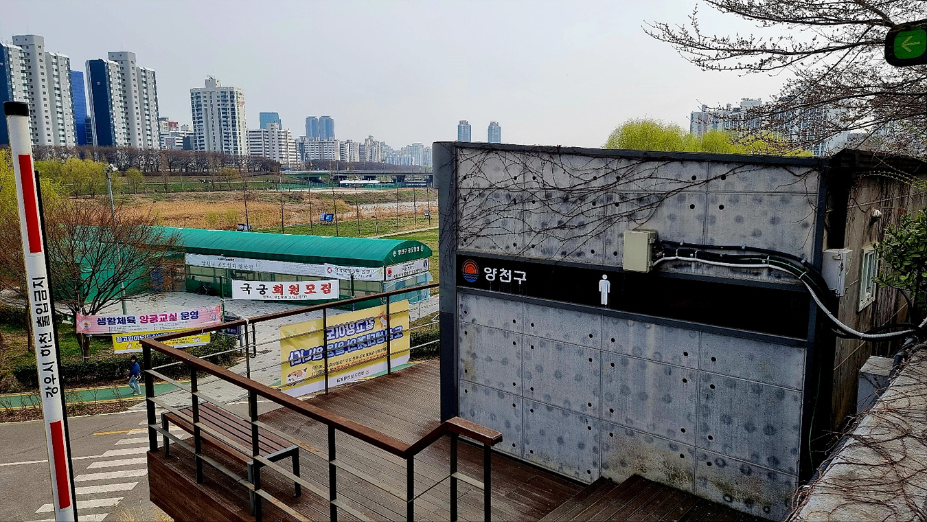 벚 나무가 지천으로 있는 길을 따라가면서 안양천 둔치를 내려다 보면 양천국궁장도 보인다,