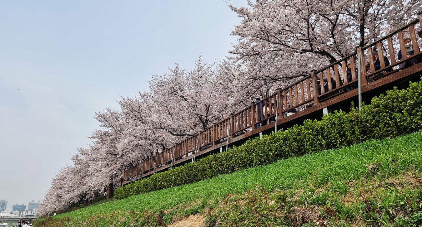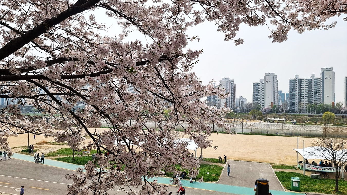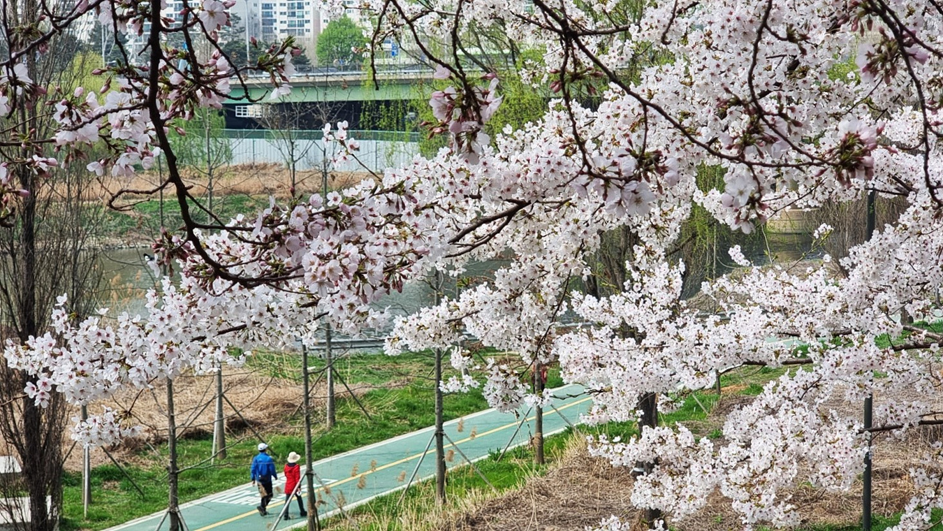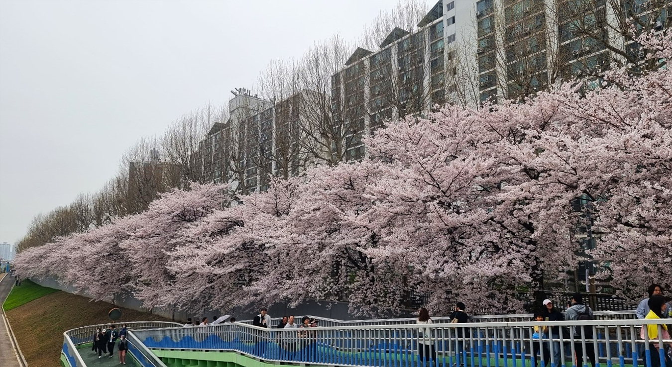 둑길에는 화려한 벚꽃이 활짝 피여있는 안양천변,