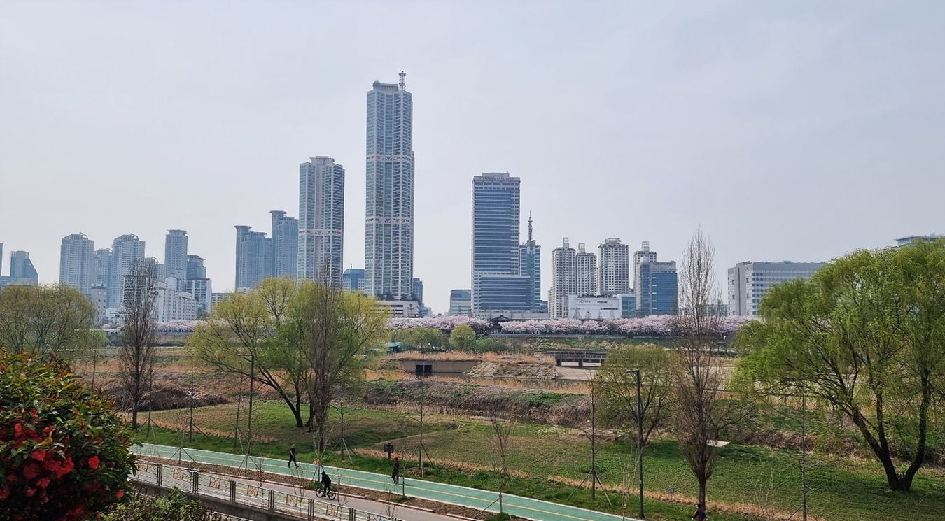 안양천과 함께 여의도 6,3빌딩보다 8m나 더 높은 목동하이페리온 오피스텔 빌딩과 현대 41타워가 그림처름 서 있다,