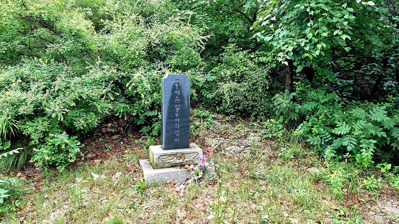 케크길 울타리 바깥 외롭게만 보이는 그리고 누군가가 꽃다발도 두고 간 흔적이 있는 비석도 있다, 고 이윤석 용사 위령비 다, 이곳에서 유해가 발견되여 세워진 위령비일 것으로 추정되는 전사자로 625 참전용사인듯 한데 계급이 없어니 의용군 신분이거나 학도병이 아니였을까?