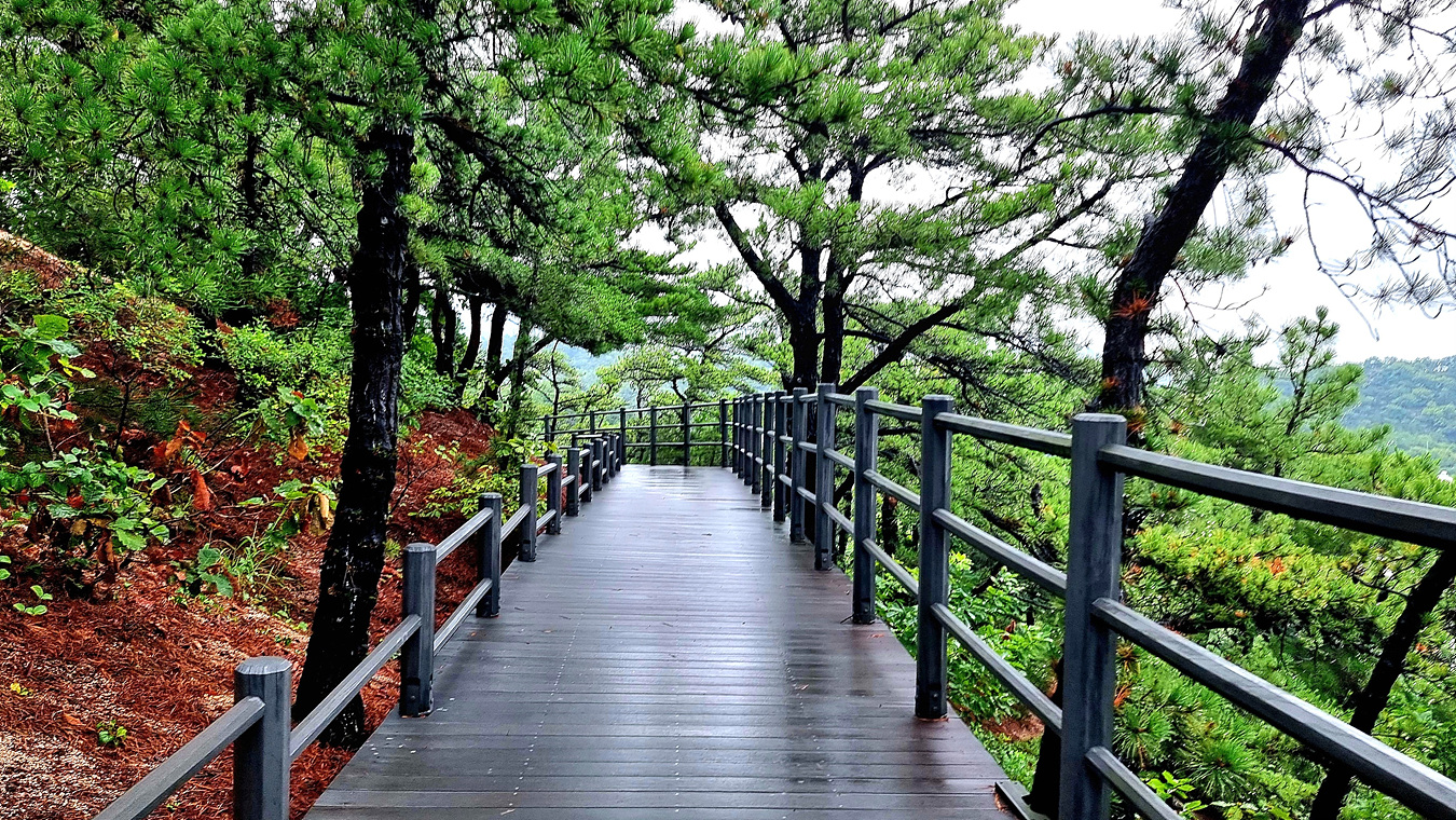 무장애 데크길 구간 바닥은 휠체어가 지날 수도 있게 목재데크로 평평하게 설치되어 있고 소나무, 잣나무 숲 터널을 가로지르며 삼림욕을 즐길 수도 있겠다.