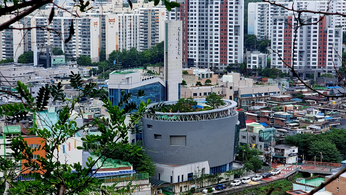 아랫마을이 보이는 곳에서 살펴보니 옥상정원을 잘 가꾸어 놓은 빌딩이 보인다,