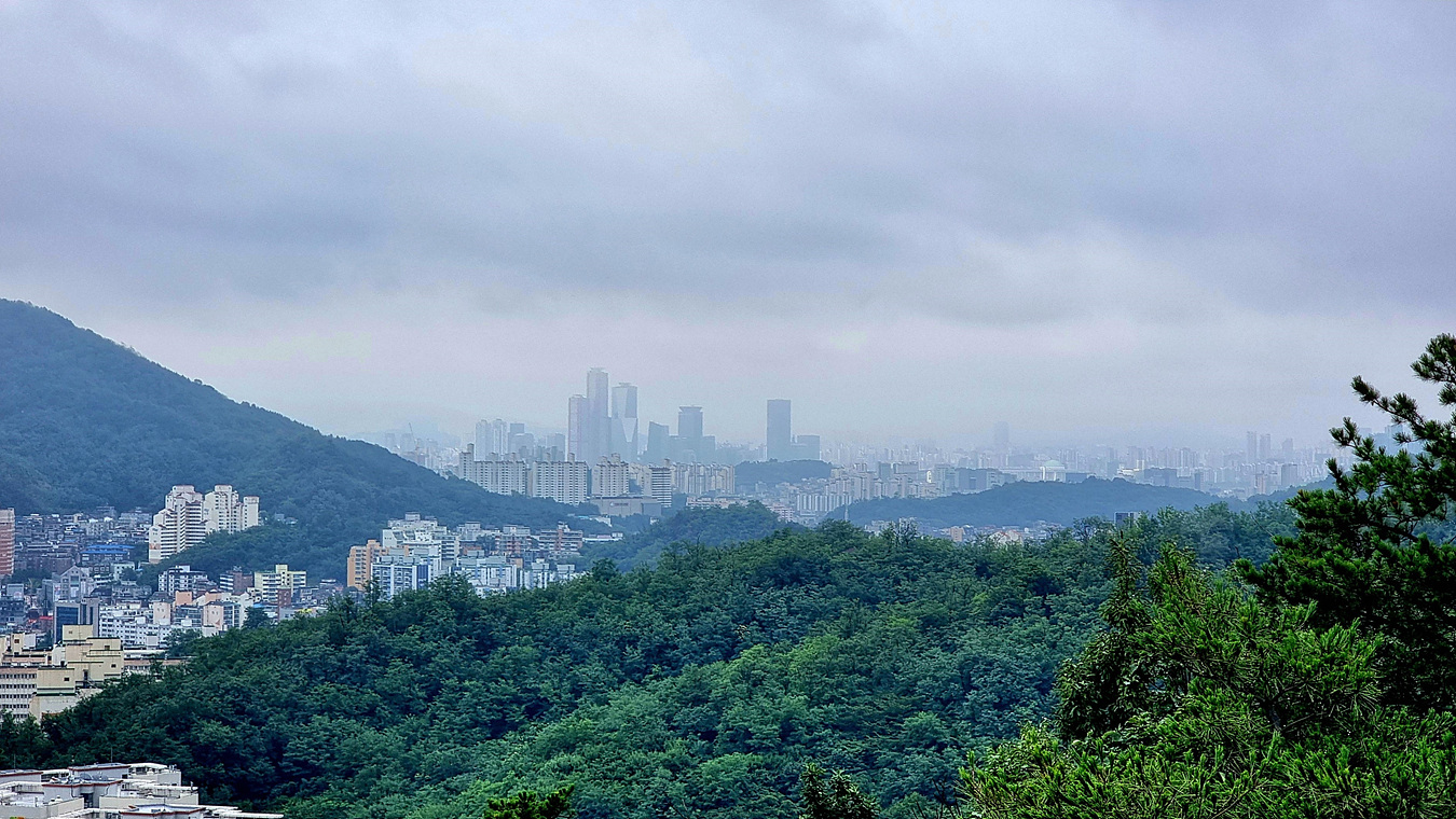 안산자락 옆으로 우뚝솟은 빌딩숲은 여의도 일대로 한강건너 영등포구와 양천구 목동 일대까지 보인다, 날이 맑어면 아주 좋은 조망처 일듯 하다,
