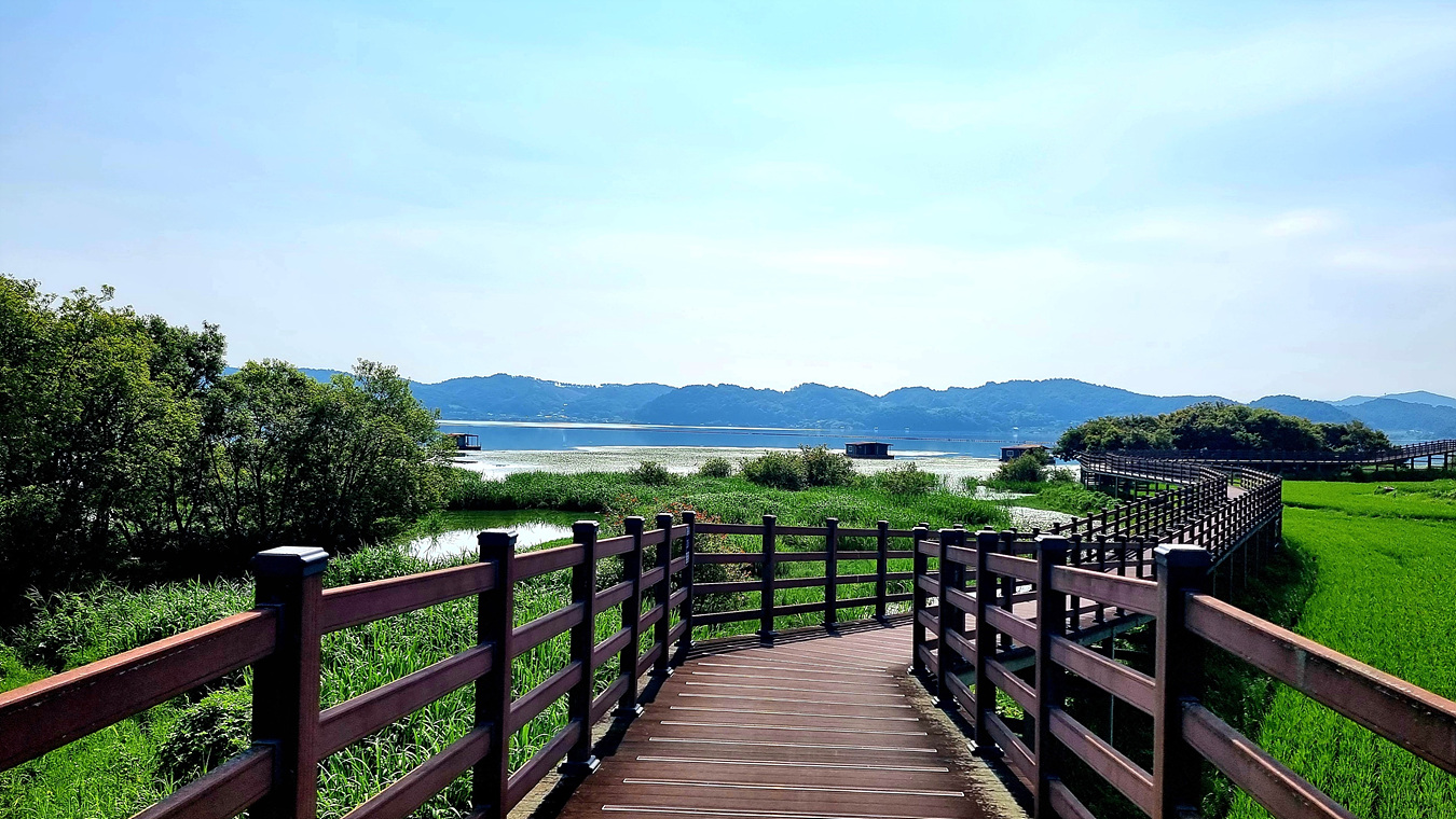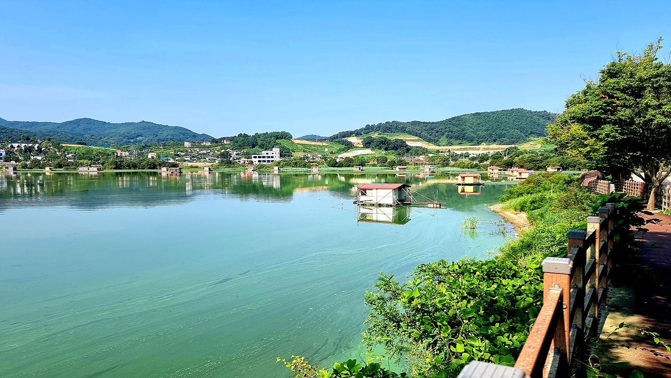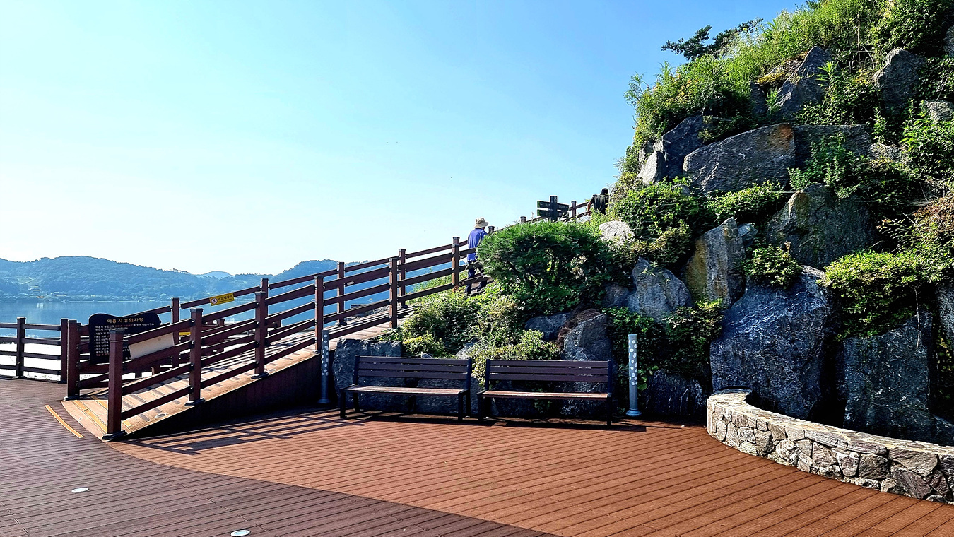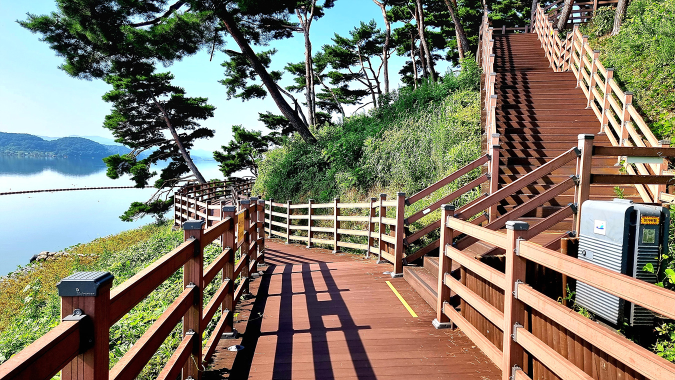 호수와 야산, 그리고 호수를 따라가는 무장애 데크길은