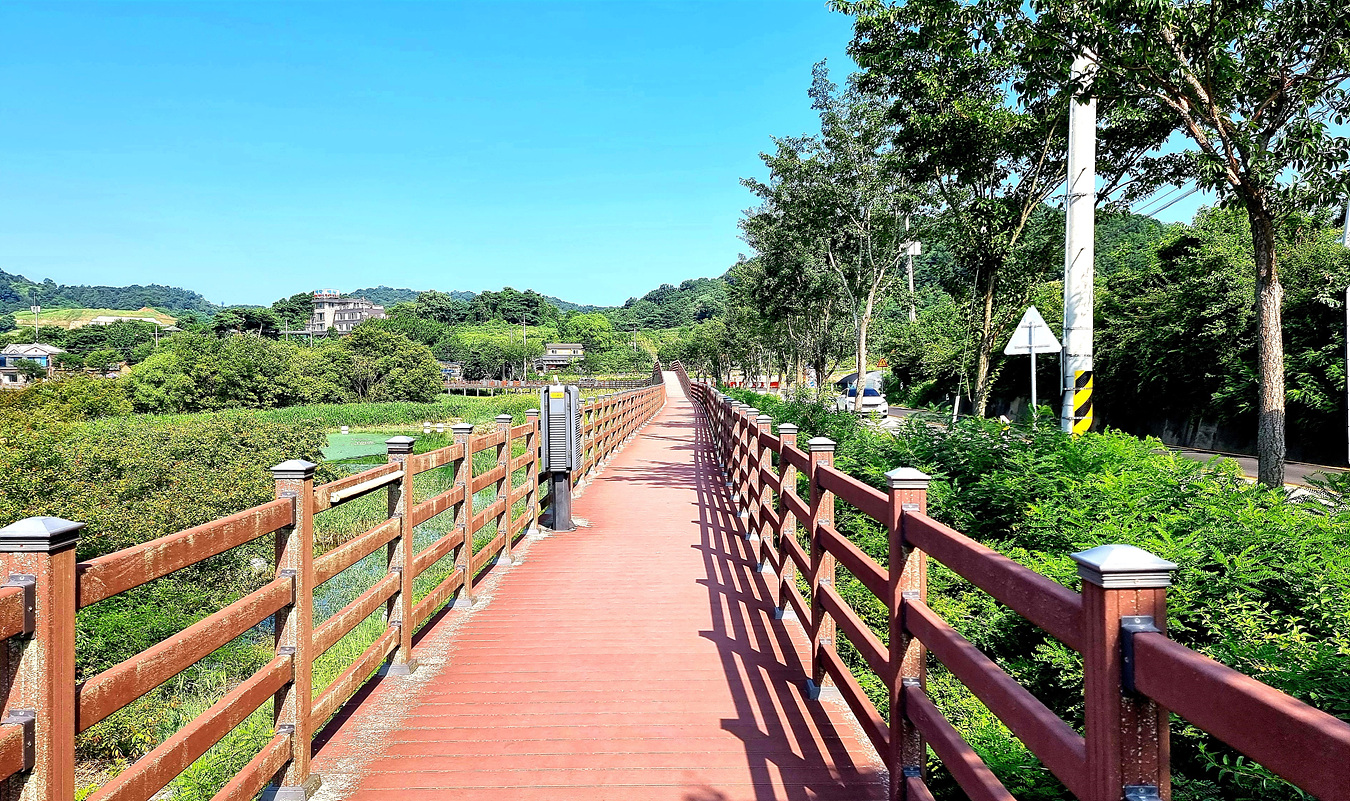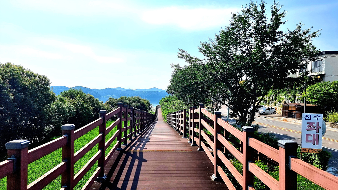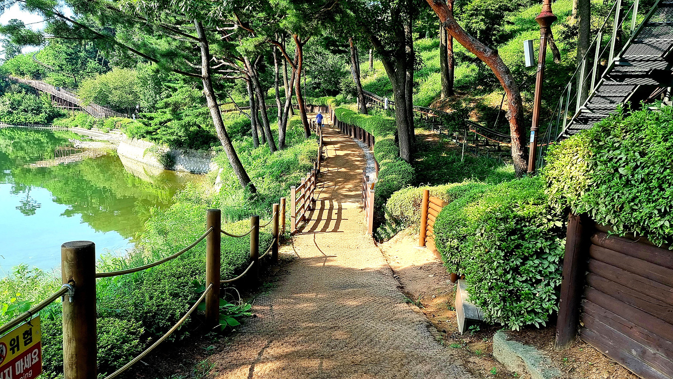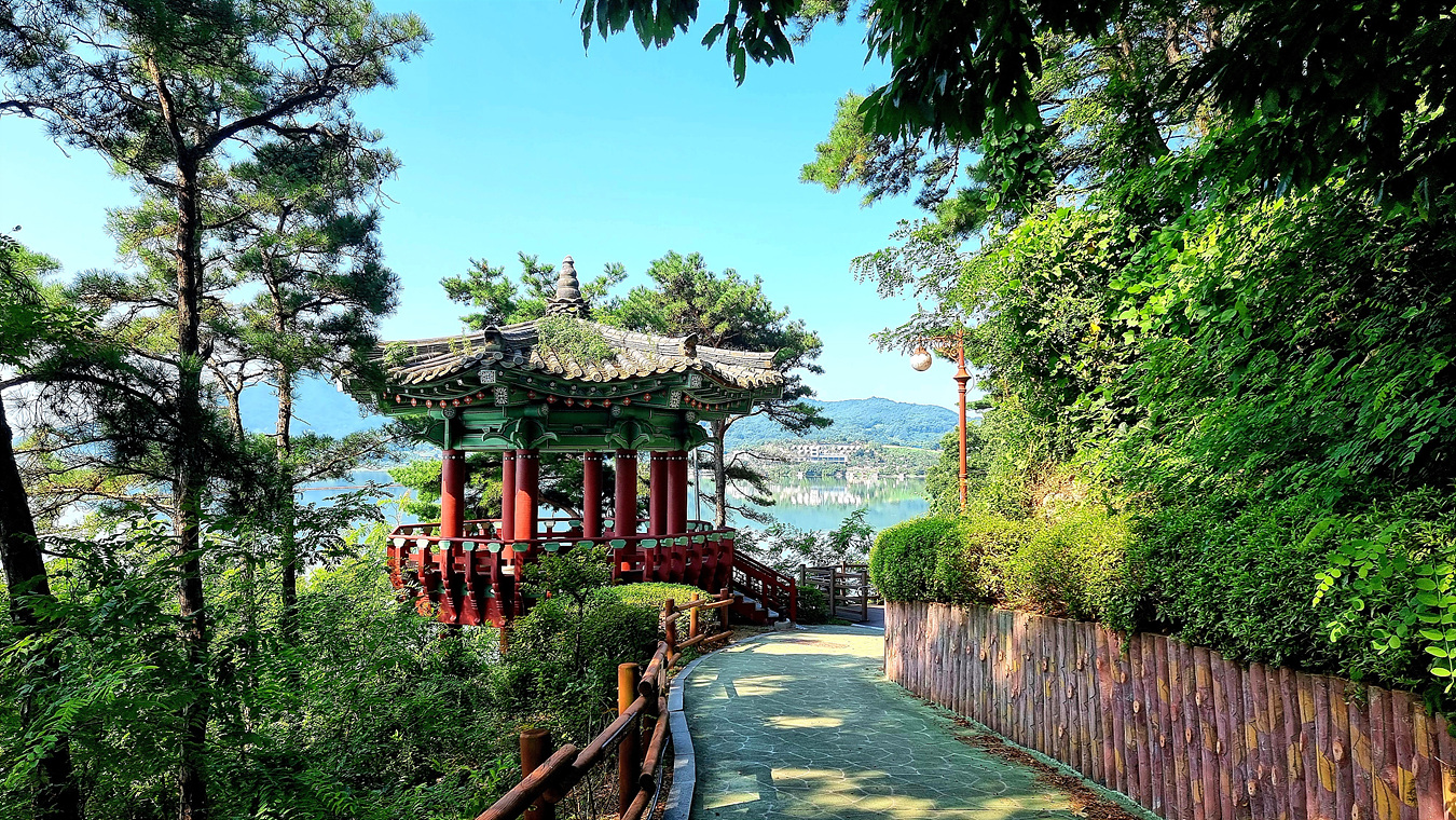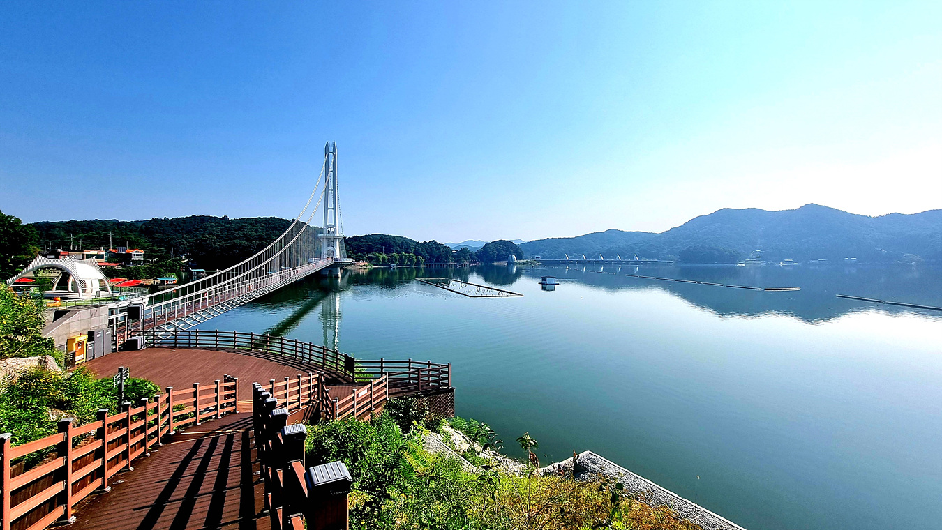 호수와 야산, 그리고 호수를 따라가는 무장애 데크길은