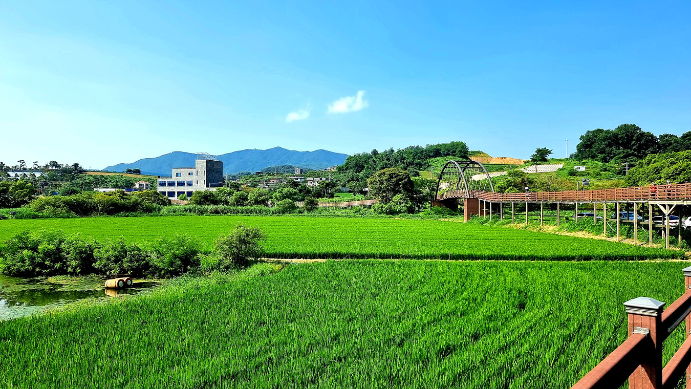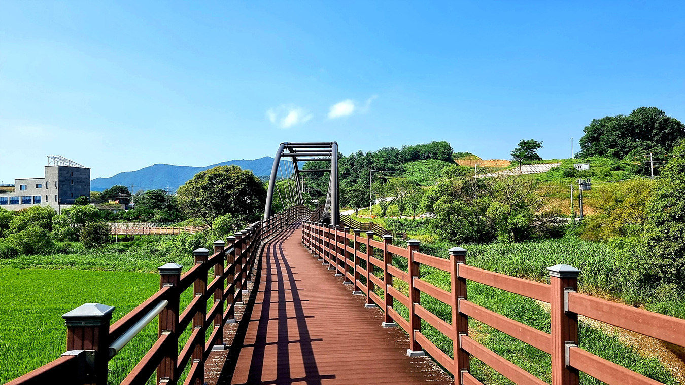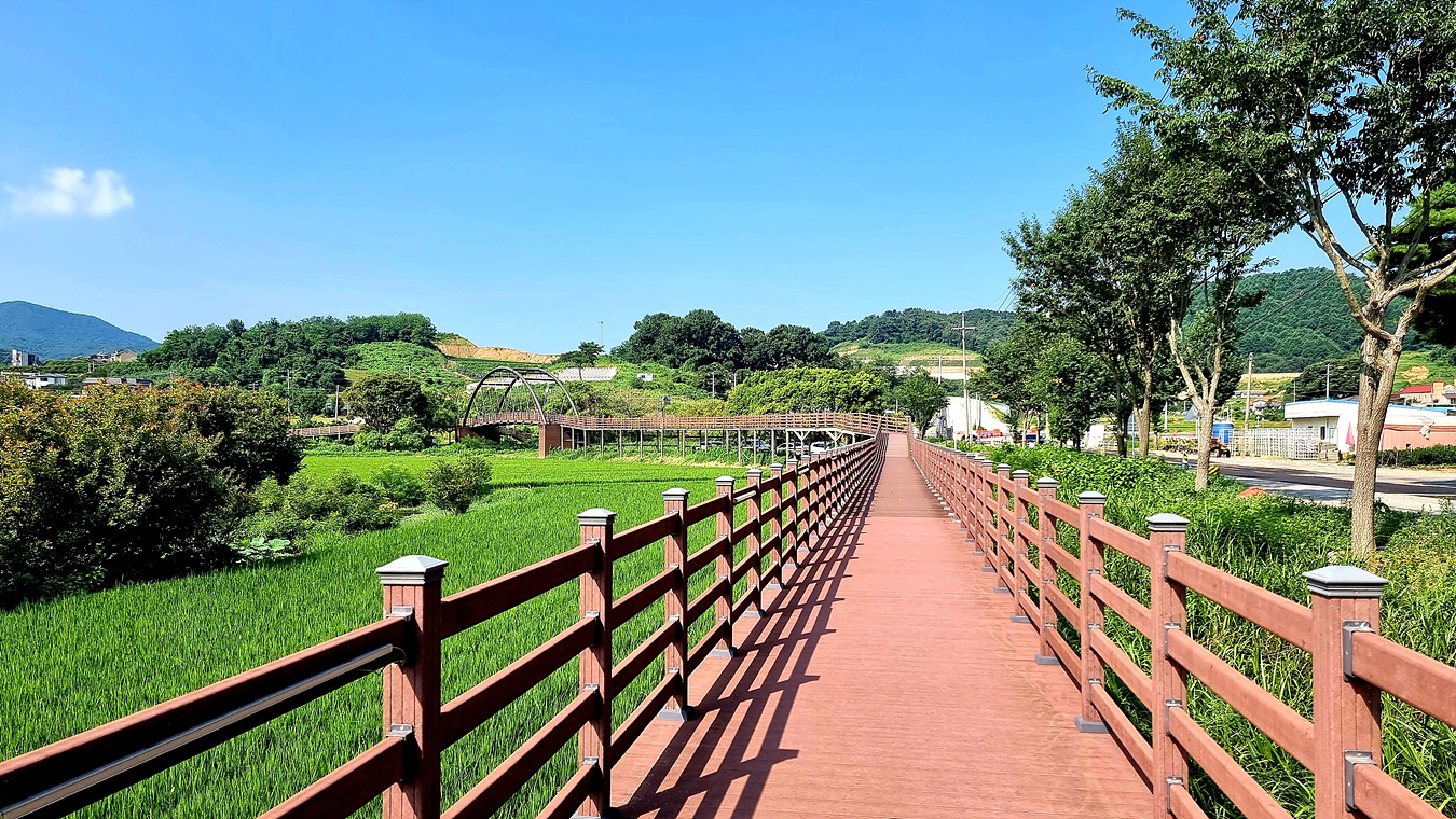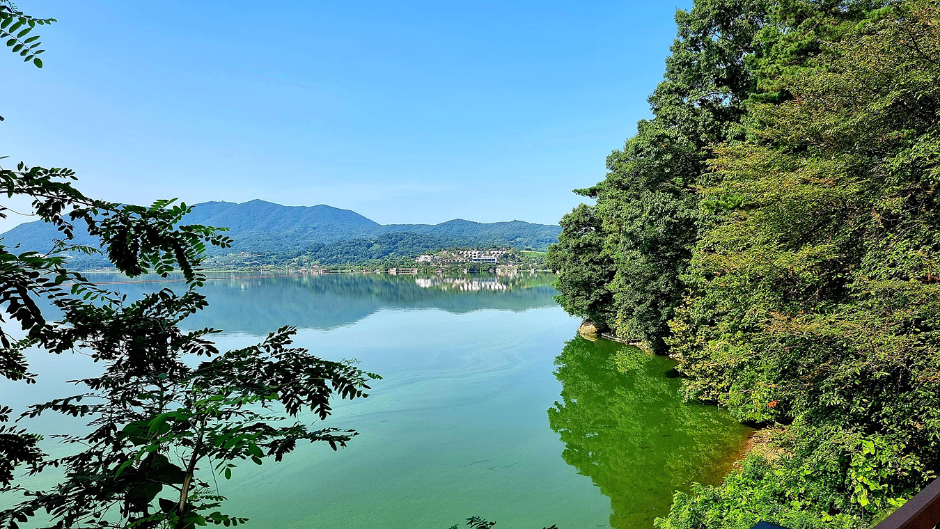 호수와 야산, 그리고 호수를 따라가는 무장애 데크길은
