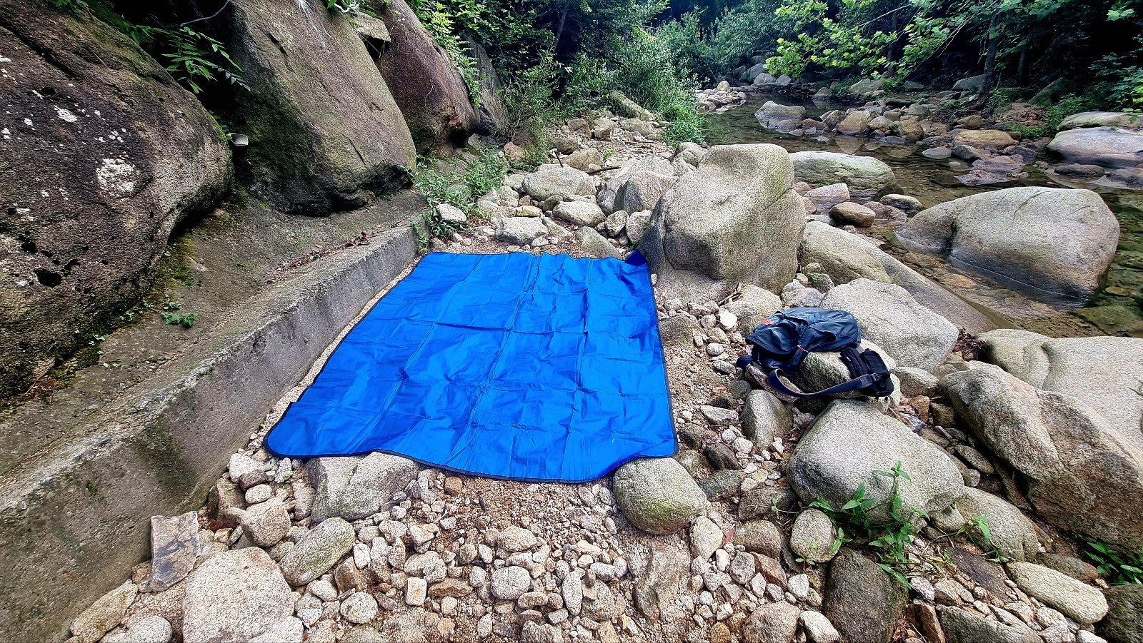 매년 몇 번은 왔다가는 단골자리가 있다, 비교적 상류라 물도 맑고 사람들도 많이 몰리지 않는 곳이라서 매년 여기로 오기는 하는데 올해도 사람이 없을련지?는 모르겠다, 이 작은 깔개는 자리를 확보하기 위한 것으로