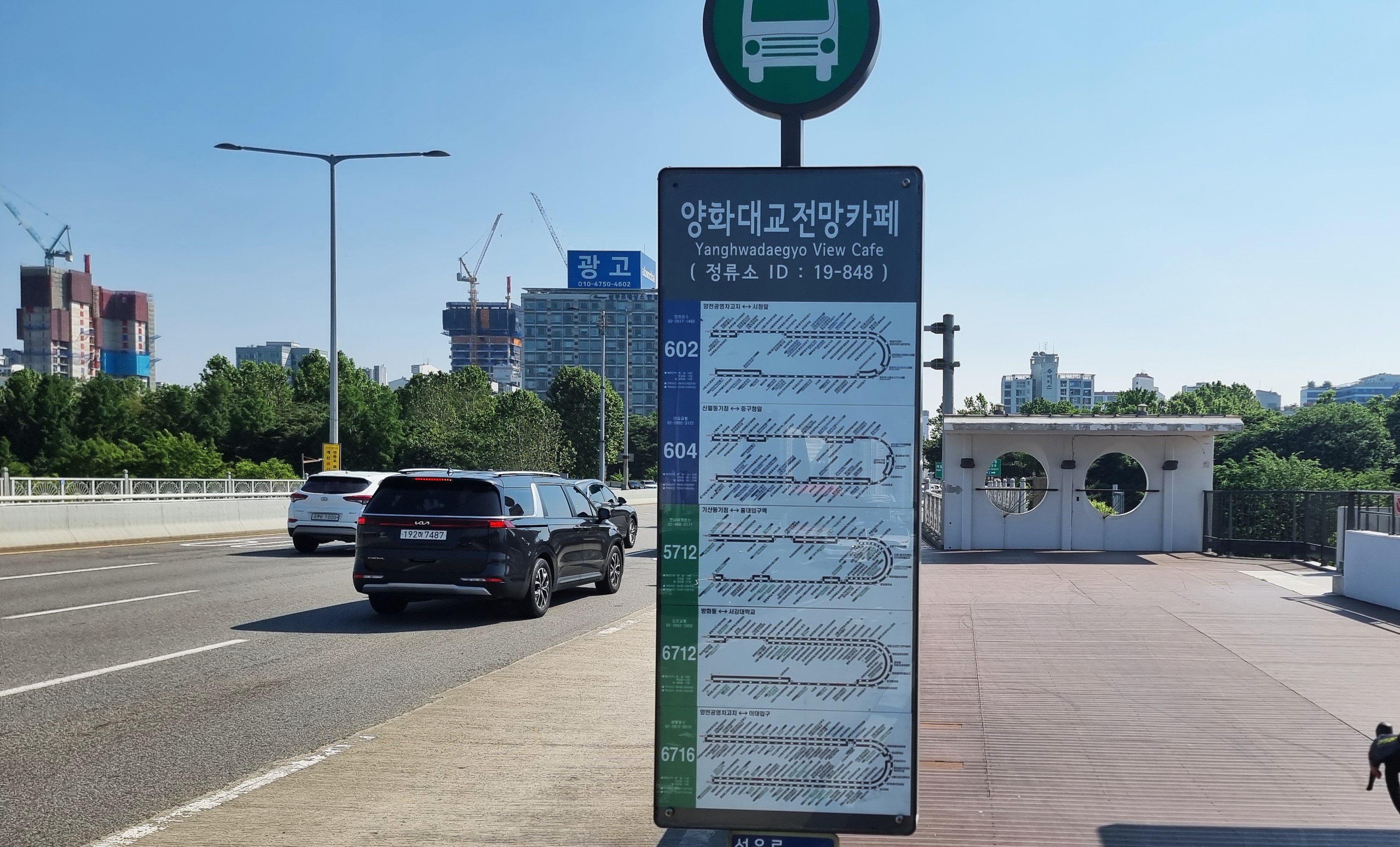 염창역과 등촌역방향으로 가는 버스를 탈 수 있지만 선유도 앞 버스정류장을 사용하면 되는데 굳이 400여m 거리에 버스정류장을 또 만든 것은 양화대교 전망카페 영업용이 아닐지?
