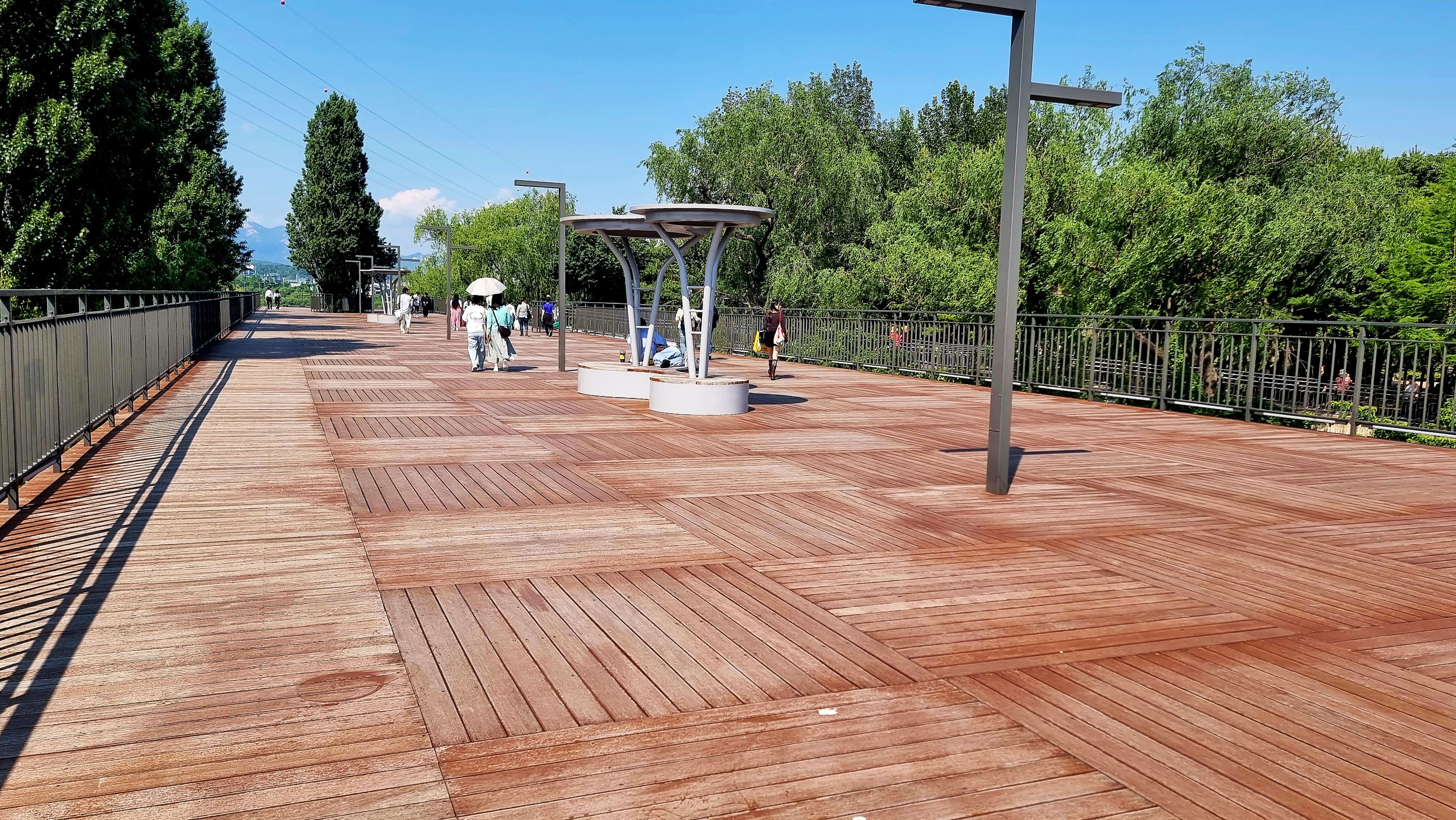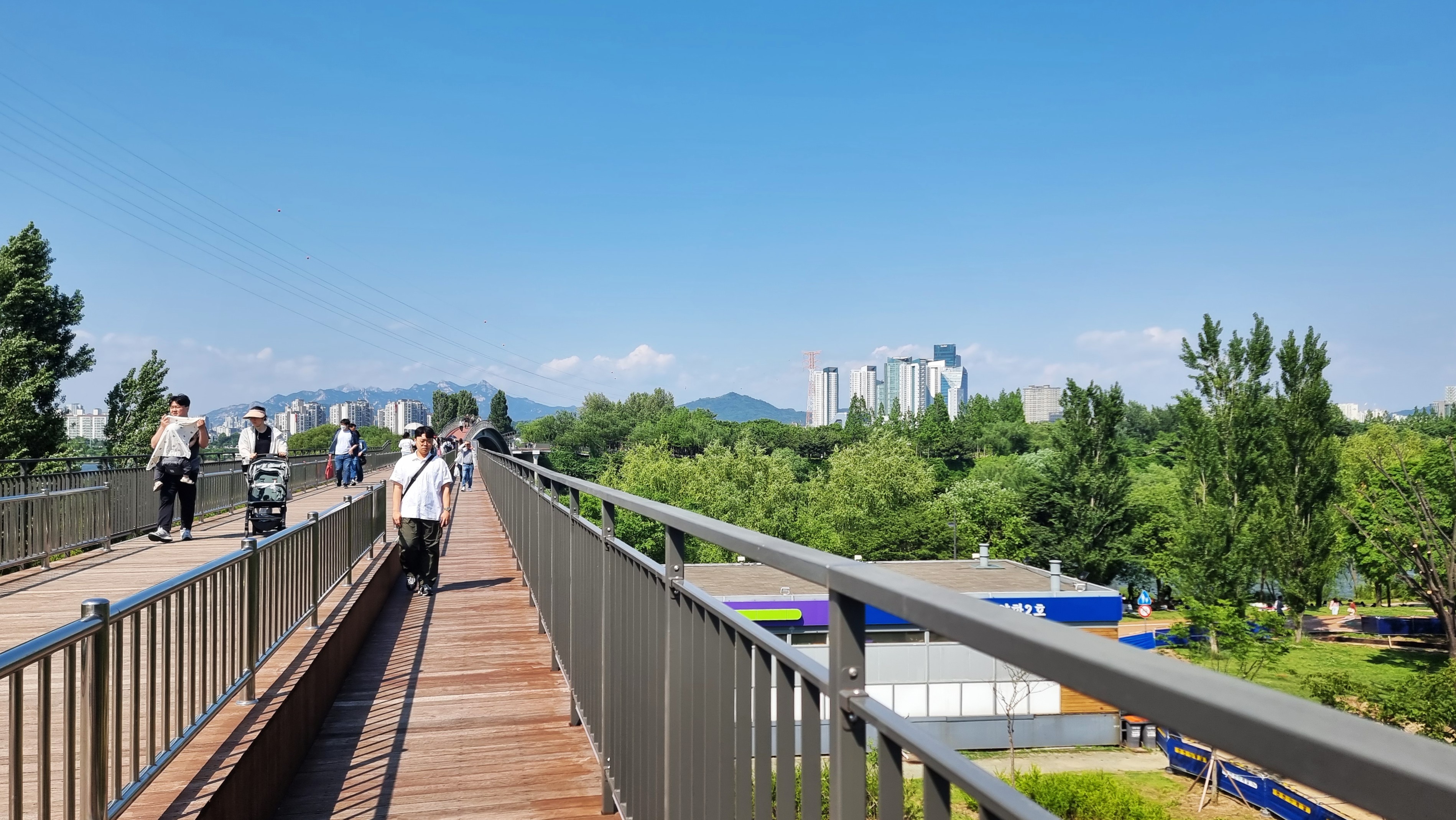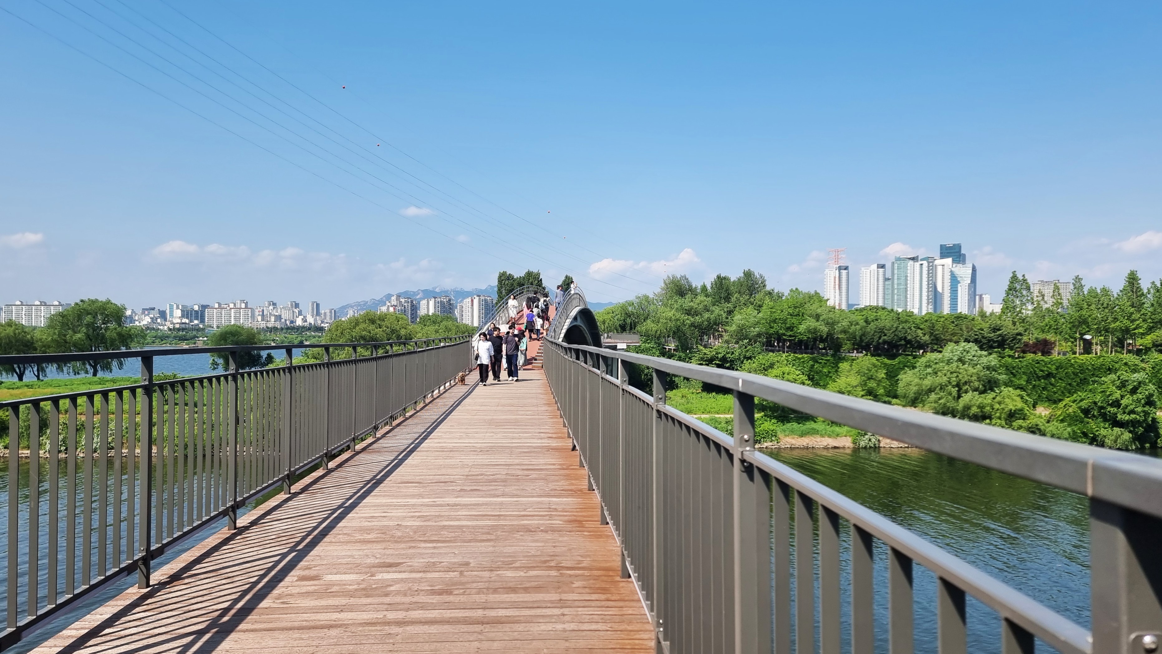 다리 바닥과 난간은 환경친화적인 목재로 만들어 자연스럽고 부드러운 느낌을 주며, 밝은 색조의 다리 구조물과 대비를 이룬다,