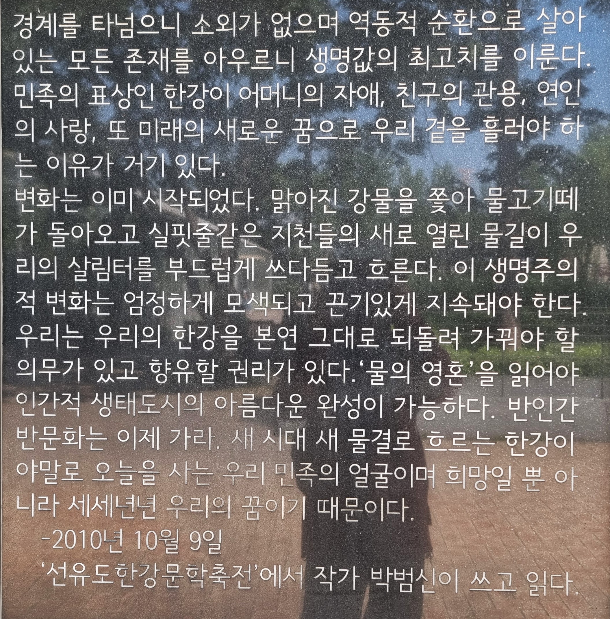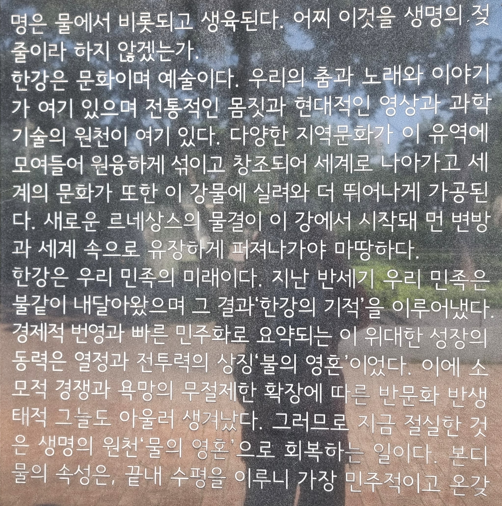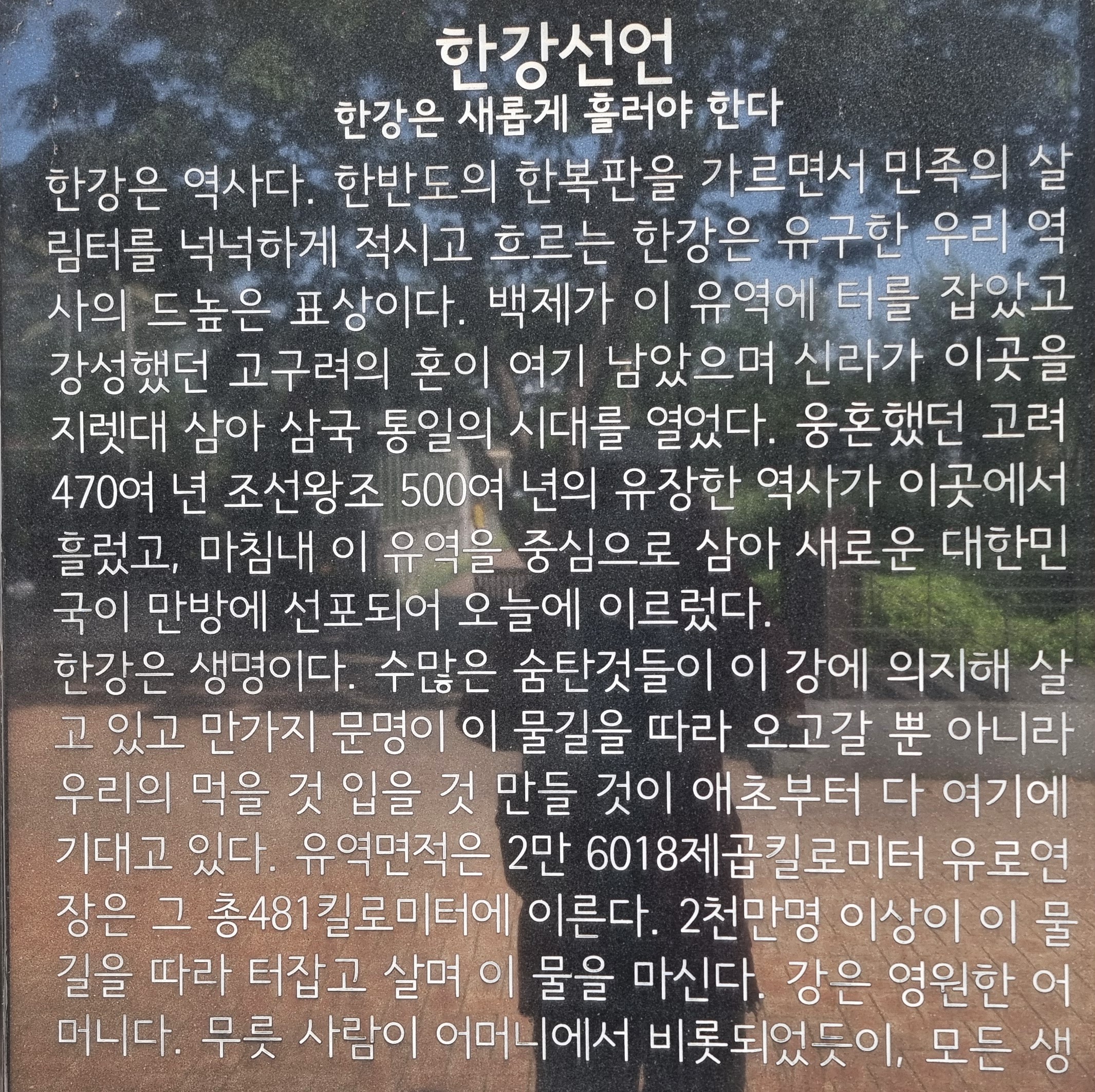 그리고 이곳에는 한강선언 "한강은 새롭게 흘러야 한다" 라는 선언문이 있는데 한강은 역사다, 한강은 생명이다, 한강은 문화이며 예술이다, 변화는 이미 시작되었다, 라는 주제의 긴 선언문 이 안내되여 있다,