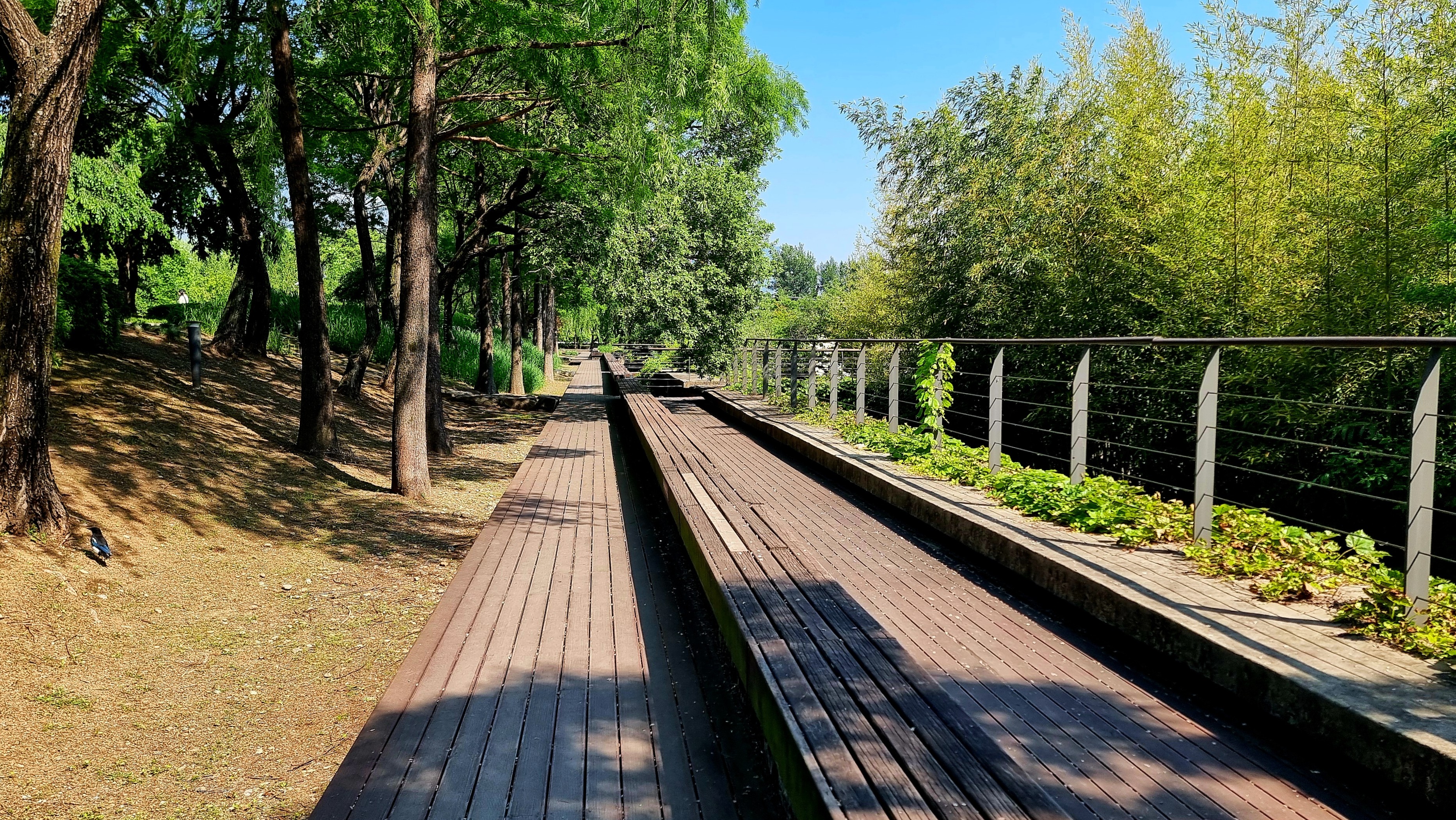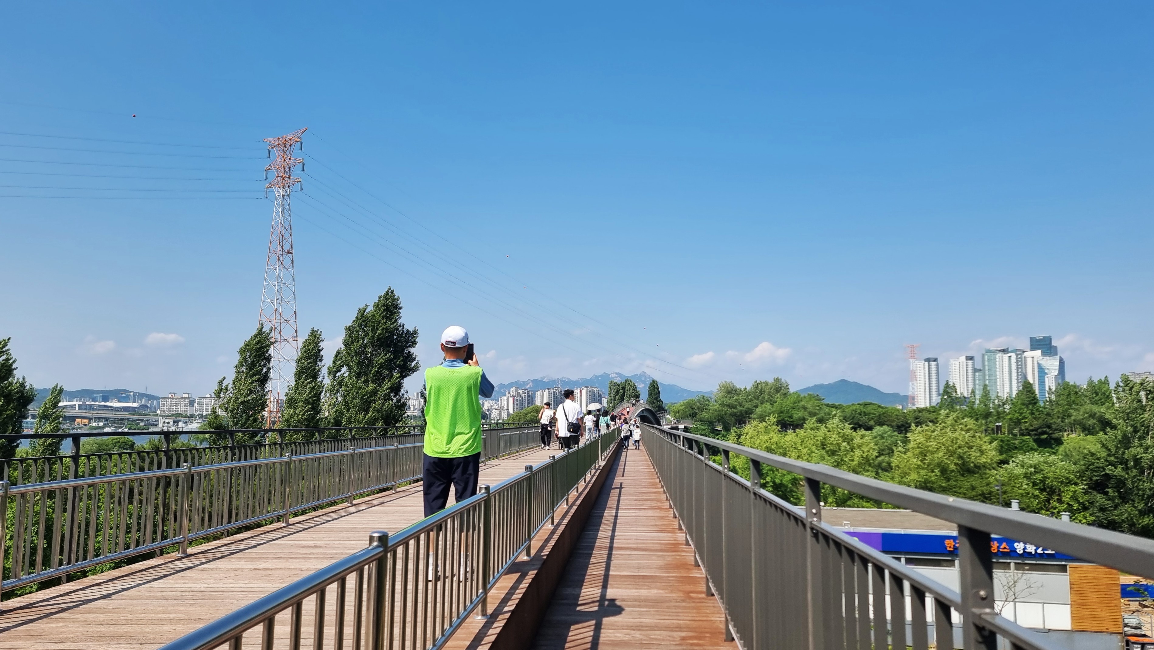 선유도는 선유교에서 양화대교 사이에 "네 개의 원형공간" "시간의 정원" "수생식물원" "녹색기둥정원" "메타세콰이어길" 과 "수질정화원" 등으로 조성되여 있는 아름다운 공원이다, 여기는 선유도 왼쪽 '시간의 정원" 옆 데크길이다,