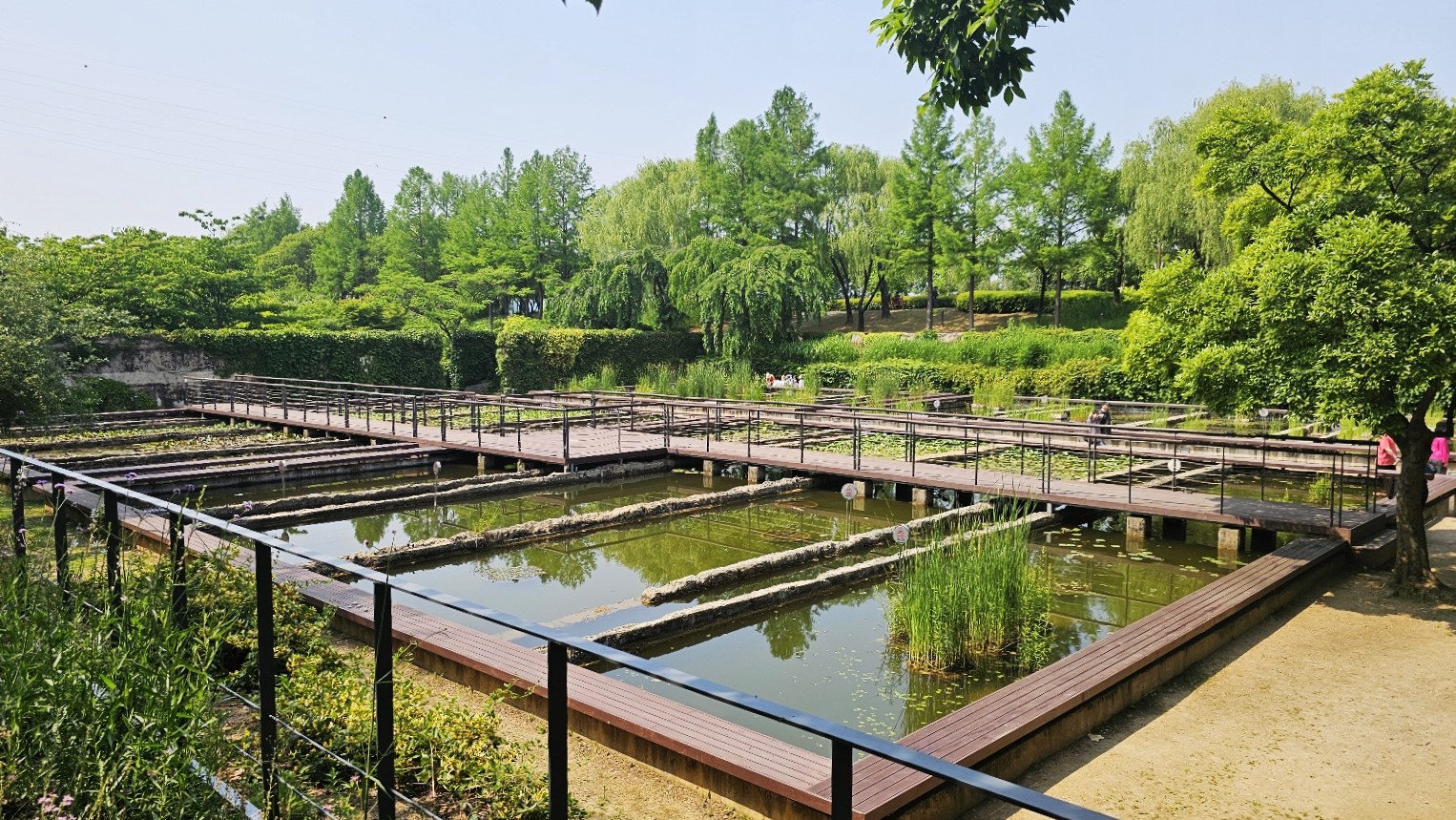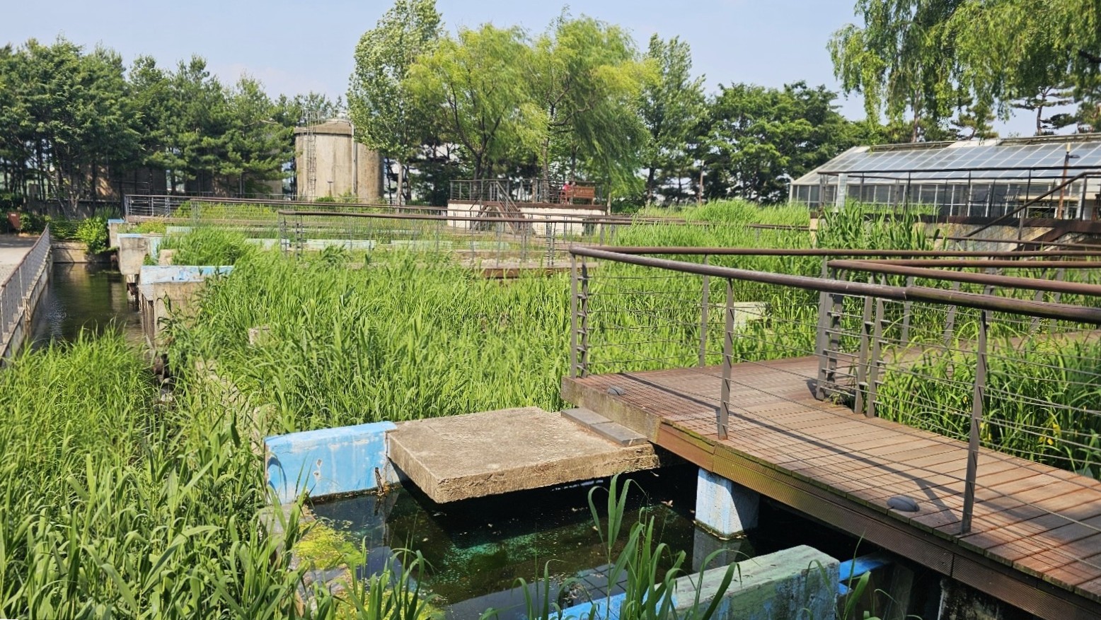 왼쪽에 수질 정화원이 있다, 이곳은 제2침전지로 가로26m 세로 43,5m, 깊이 5m의 수조 2개조로 이루어진 구조물로 물속의 불순물을 가라앉혀 제거하는 역활을 하던 곳이다,