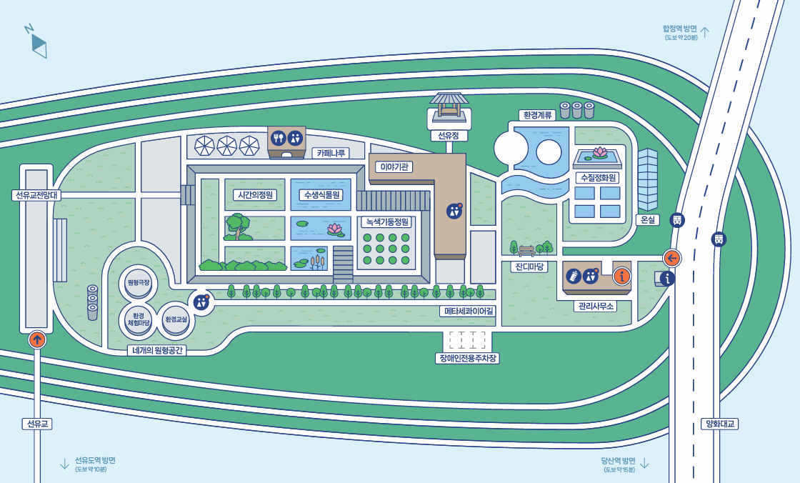 선유도 공원은 페기된 사업시설을 재 활용한 우리나라 최초의 환경재생 생태공원이자 "물의 공원" 이다, 선유도 일대 110,407m2(약 33,400여평)의 부지에는 약품 침전지를 재활용한 수생식물원과, 시간의 정원을 비롯하여