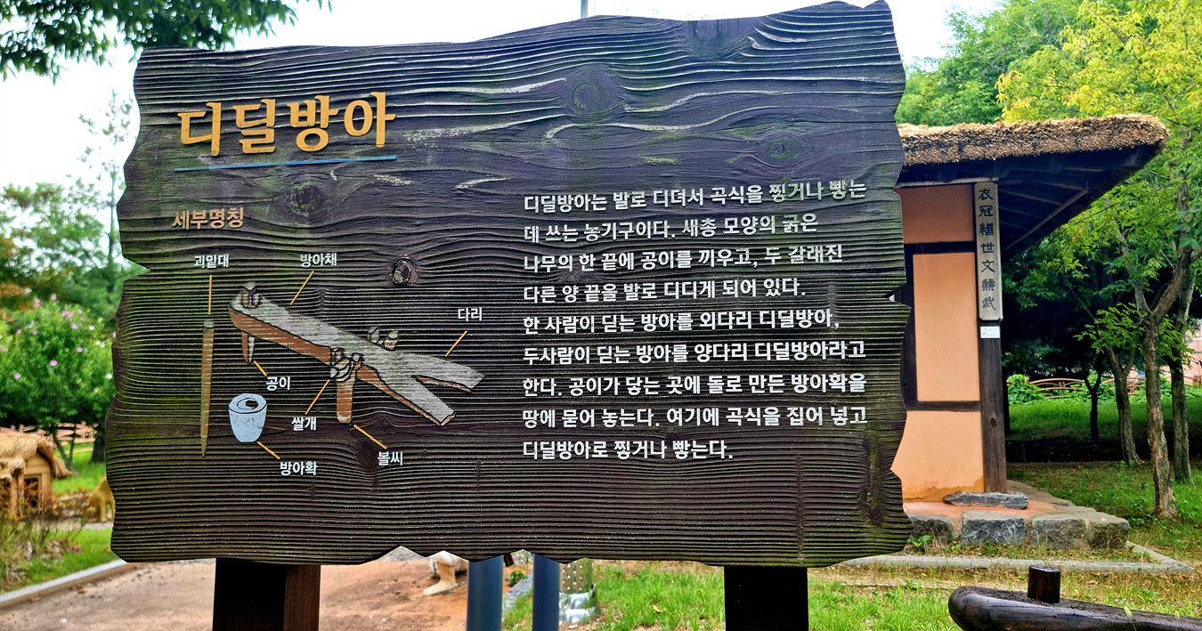 디딜방아는 발로 디뎌서 곡식을 찧거나 빻는데 쓰는 농기구로 새총모양의 굵은 나무의 한 끝에 공이를 끼우고 두 갈래진 다른 양 끝을 발로 디디게 되어있다, 한 사람이 딛는 방아는 외다리 디딜방아 두사람이 딛는 방아는 양다리 디딜방아다, 공이가 닿는 곳에는 돌로 만든 방아확을 땅에 묻어 놓고 여기에 곡식을 집어 넣고 디딜방아로 찧거나 빻는다,