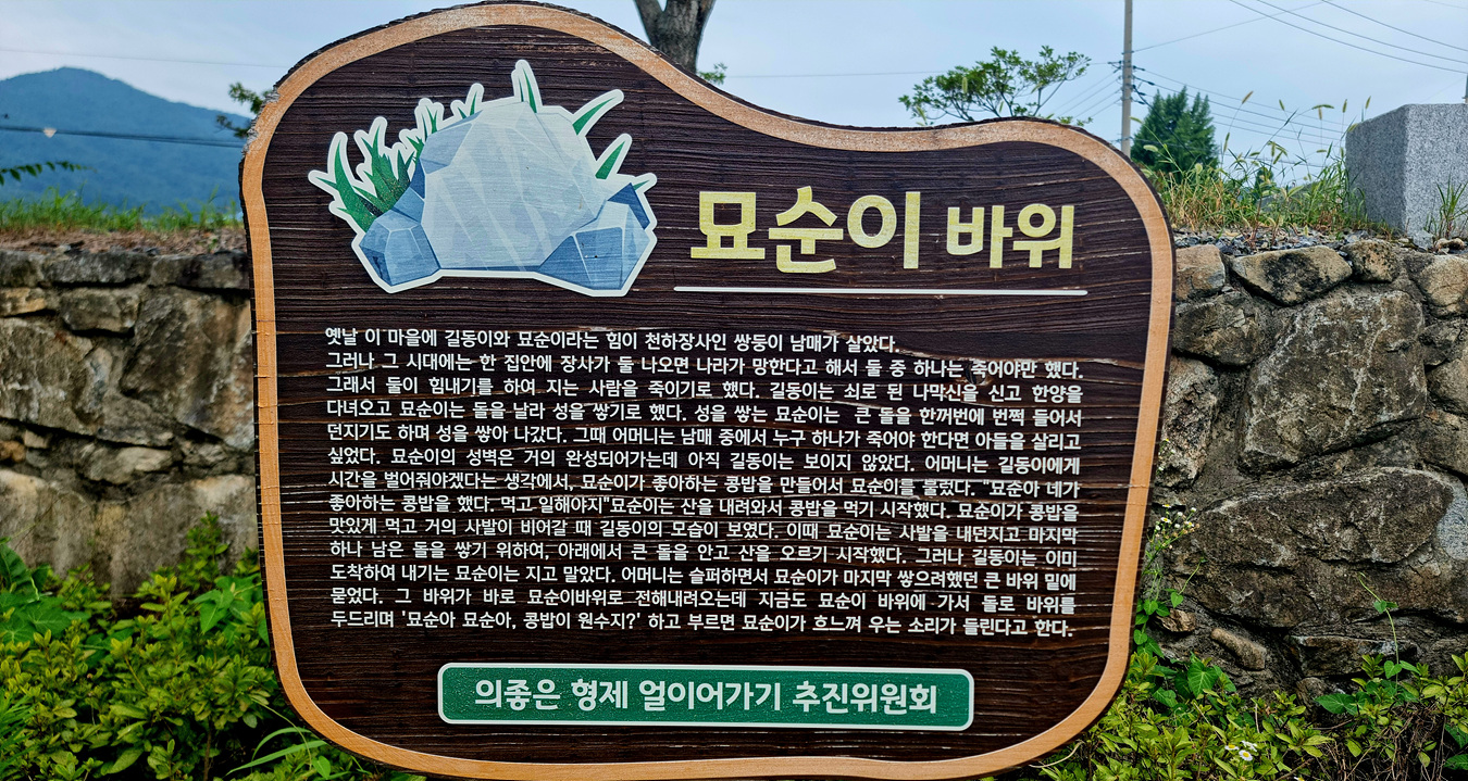 그리고 묘순이바위 이야기도 있는데 옛날 이마을에 길동이와 묘순 이라는 힘이 천하장사인 쌍둥이 남매가 살았는데 그 시대에는 한 집안에 장사가 둘이 나오면 나라가 망한다고 해서 둘 중 하나는 죽어야만 했다, 라고 시작하는 형제간의 이야기가 전설이 되여 내려오는 슬픈 이야기도 안내되여 있다,