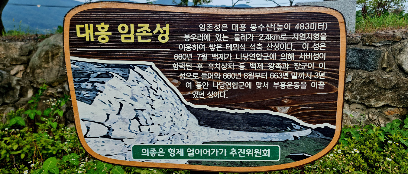 의좋은 형제공원 주차장으로 들어가면 대흥 임존성 안내판이 있는데 임존성은 봉수산(해발 483m)봉우리에 있는 둘레 2,4km의 자연지형을 이용해 쌓은 테뫼식 석축산성으로 660년 7월 백제가 나당 연합군에 의해 사비성이 함락된 후 백제왕족과 흑치상지등 장군이 이 성으로 들어와 660년 8월 부터 663년 말까지 3년여 동안 나당 연합군에 맞서 부흥운동을 이끌었던 성(城)으로 의좋은 형제공원과는 지근 거리에 있는 城이다,