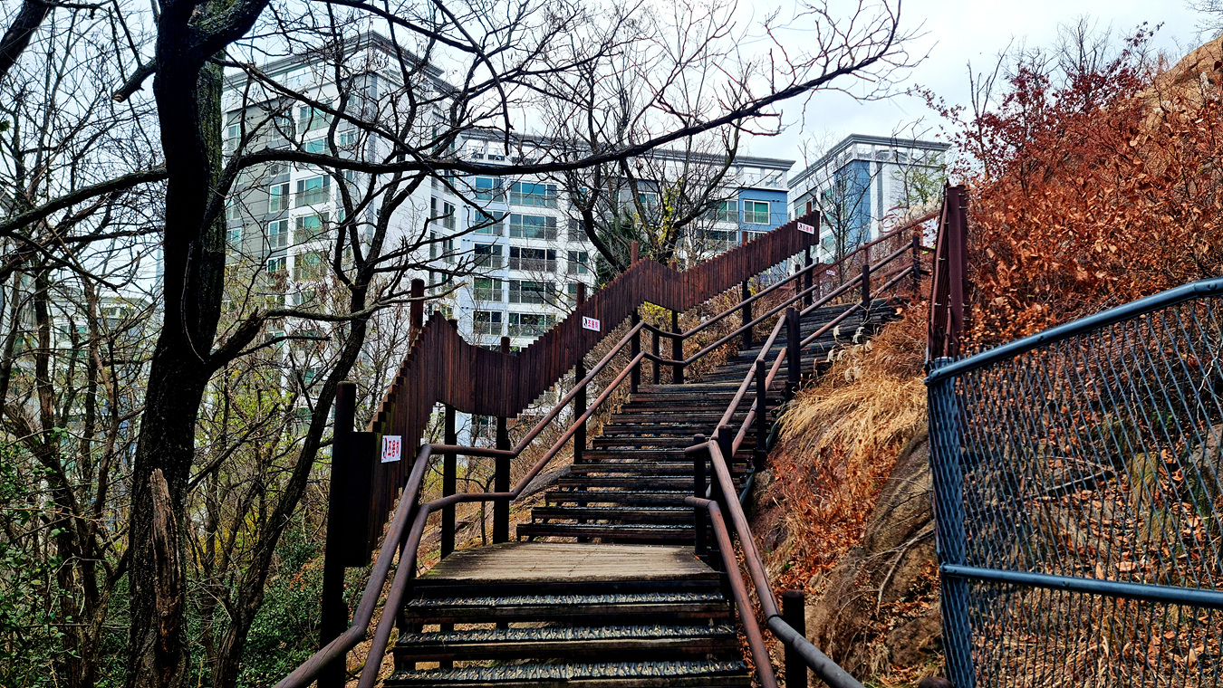 둘레길은 마을버스 종점을 지나 불광중학교 뒤 산으로 올라가는 좁은 돌계단으로 이어진다,