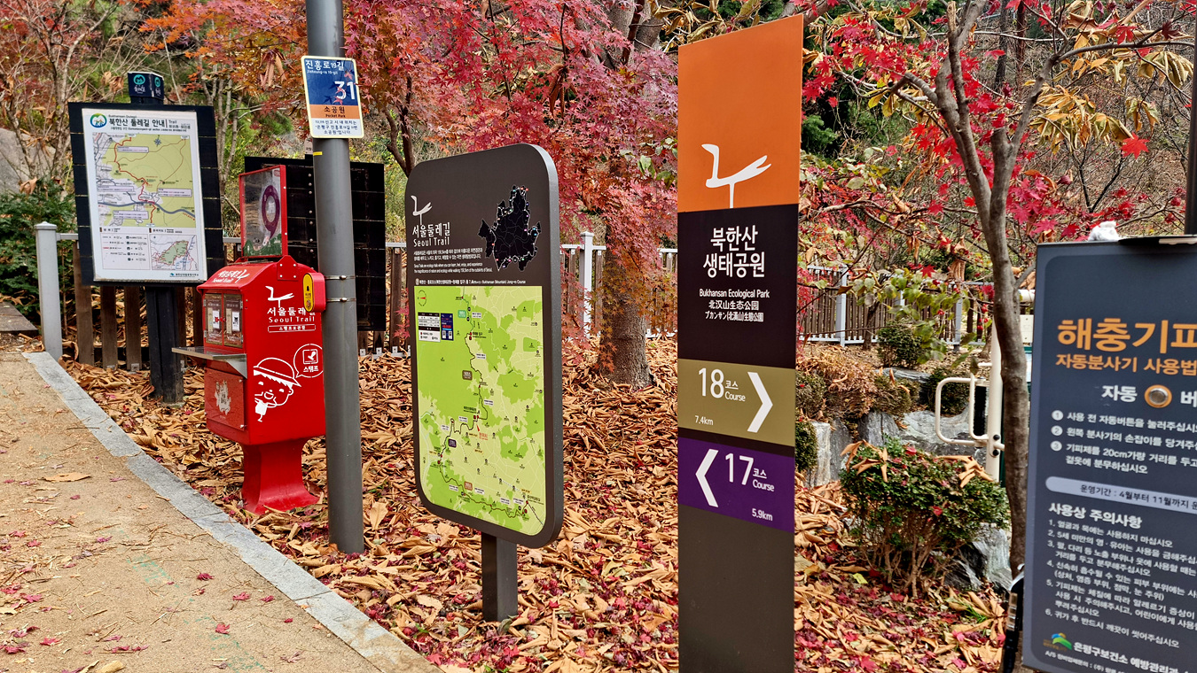 이곳에서는 서울둘레길 17구간 "하늘과 맞다은 길" 과 북한산둘레길 17코스(종전 8코스) "구름정원길"에 대한 각종 안내판들이 자세한 정보를 알려준다, 참고로 위 사진의 붉은 우체통은 서울둘레길 스템프 함이다,