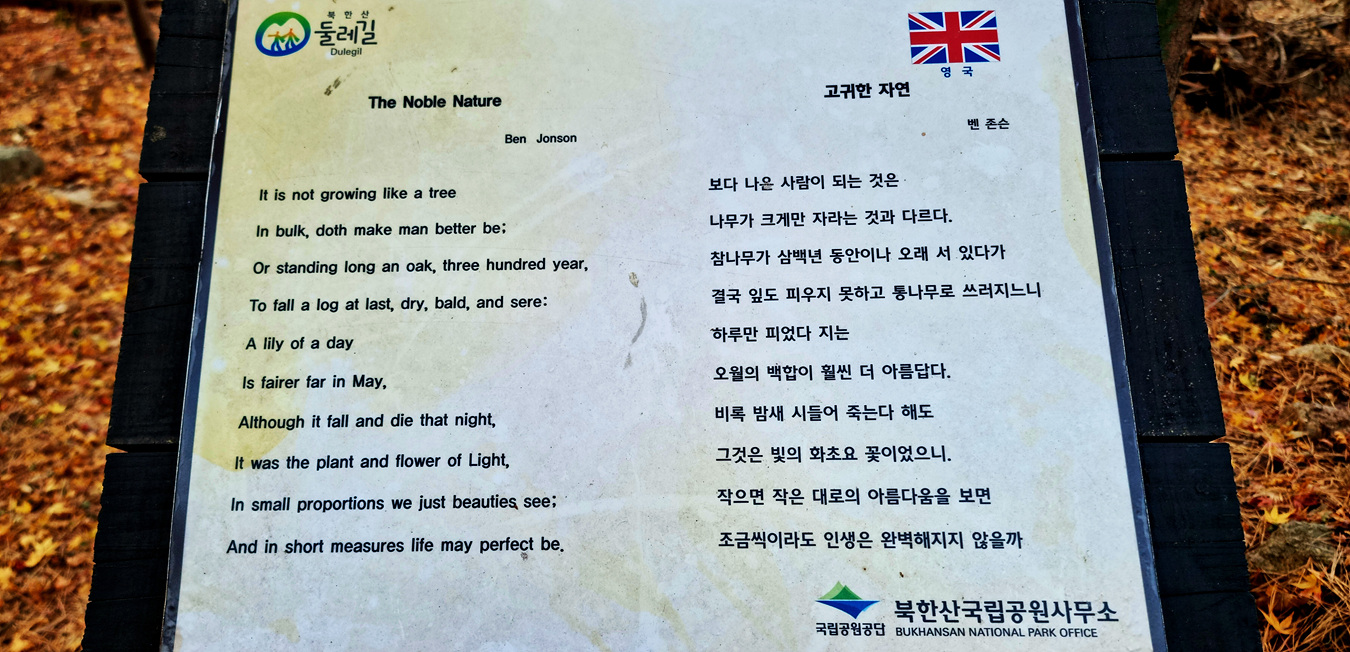 보다 나은 사람이 되는 것은 나무가 크게만 자라는 것과는 다르다고 시작하는 영국 벤 존슨의 "고귀한 자연" 의 시 도 한편이 전시되여 있다,
